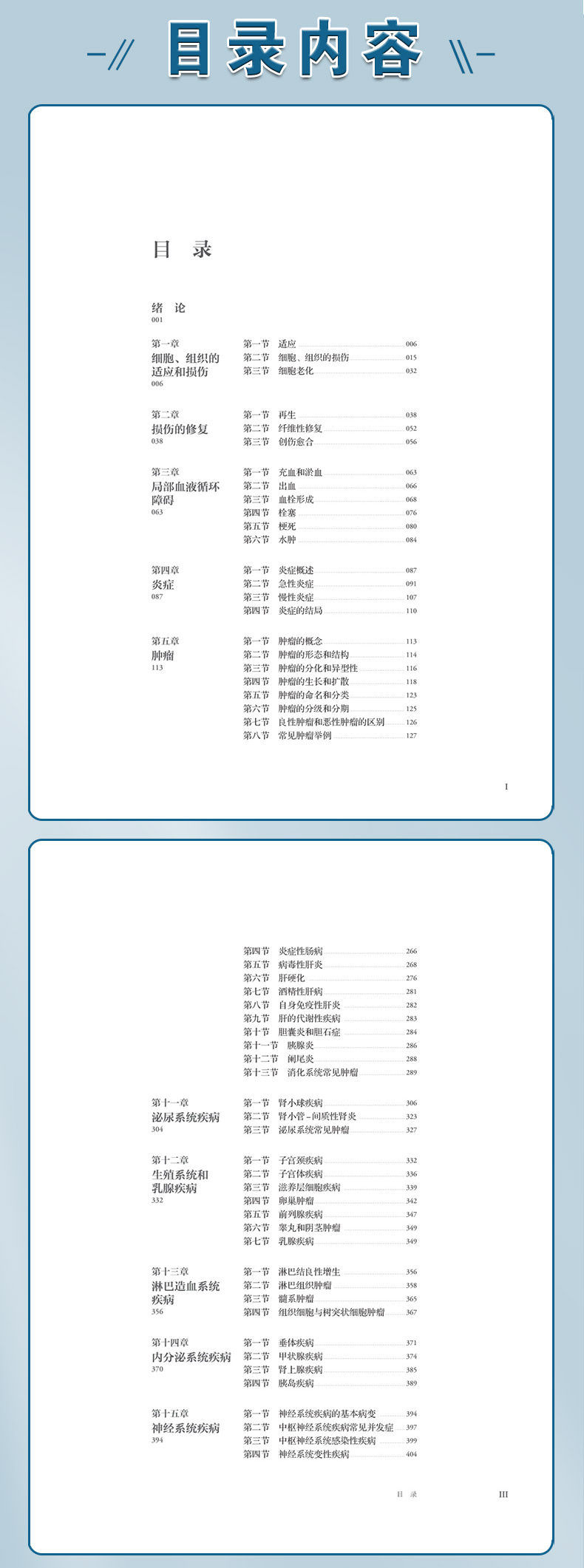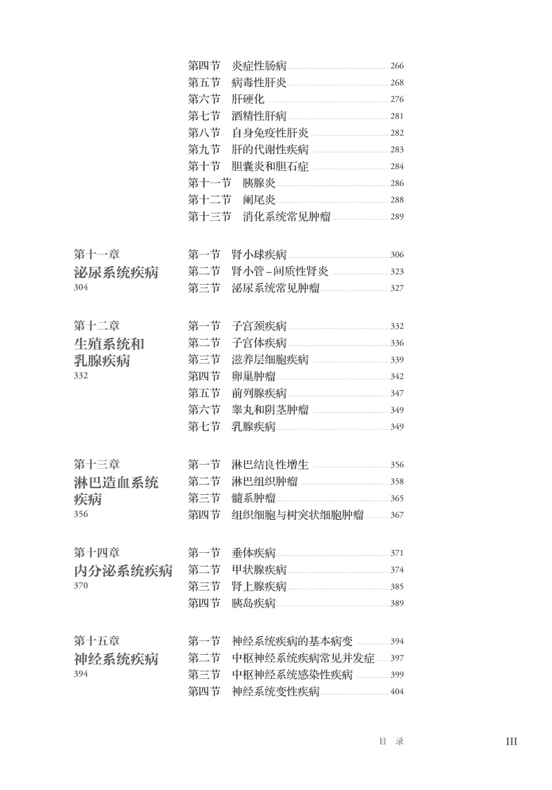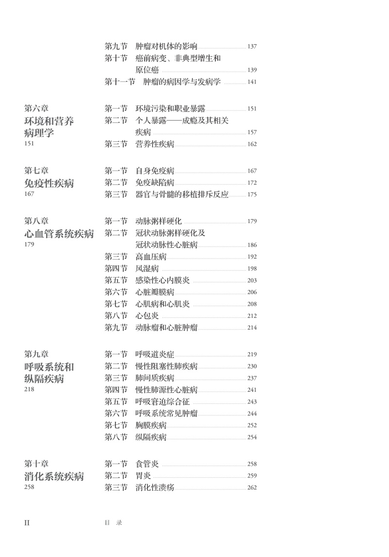 绪 论/001 第一章细胞、组织的适应和损伤/006 第一节 适应 / 006 第二节 细胞、组织的损伤 / 015 第三节 细胞老化 / 032 第二章损伤的修复/038 第一节 再生 / 038 第二节 纤维性修复 / 052 第三节 创伤愈合 / 056 第三章局部血液循环障碍/063 第一节 充血和淤血 / 063 第二节 出血 / 066 第三节 血栓形成 / 068 第四节 栓塞 / 076 第五节 梗死 / 080 第六节 水肿 / 084 第四章炎症/087 第一节 炎症概述 / 087 第二节 急性炎症 / 091 第三节 慢性炎症 / 107 第四节 炎症的结局 / 110 第五章肿瘤/113 第一节 肿瘤的概念 / 113 第二节 肿瘤的形态和结构 / 114 第三节 肿瘤的分化和异型性 / 116 第四节 肿瘤的生长和扩散 / 118 第五节 肿瘤的命名和分类 / 123 第六节 肿瘤的分级和分期 / 125 第七节 良性肿瘤和恶性肿瘤的区别 / 126 第八节 常见肿瘤举例 / 127 第九节 肿瘤对机体的影响 / 137 第十节 癌前病变、非典型增生和原位癌 / 139 第十一节 肿瘤的病因学与发病学 / 141 第六章环境和营养病理学/151 第一节 环境污染和职业暴露 / 151 第二节 个人暴露——成瘾及其相关疾病 / 157 第三节 营养性疾病 / 162 第七章免疫性疾病/167 第一节 自身免疫病 / 167 第二节 免疫缺陷病 / 172 第三节 器官与骨髓的移植排斥反应 / 175 第八章心血管系统疾病/179 第一节 动脉粥样硬化 / 179 第二节 冠状动脉粥样硬化及冠状动脉性心脏病 / 186 第三节 高血压病 / 192 第四节 风湿病 / 198 第五节 感染性心内膜炎 / 203 第六节 心脏瓣膜病 / 206 第七节 心肌病和心肌炎 / 208 第八节 心包炎 / 212 第九节 动脉瘤和心脏肿瘤 / 214 第九章呼吸系统和纵隔疾病/218 第一节 呼吸道炎症 / 219 第二节 慢性阻塞性肺疾病 / 230 第三节 肺间质疾病 / 237 第四节 慢性肺源性心脏病 / 241 第五节 呼吸窘迫综合征 / 243 第六节 呼吸系统常见肿瘤 / 244 第七节 胸膜疾病 / 252 第八节 纵隔疾病 / 254 第十章消化系统疾病/258 第一节 食管炎 / 258 第二节 胃炎 / 259 第三节 消化性溃疡 / 262 第四节 炎症性肠病 / 266 第五节 病毒性肝炎 / 268 第六节 肝硬化 / 276 第七节 酒精性肝病 / 281 第八节 自身免疫性肝炎 / 282 第九节 肝的代谢性疾病 / 283 第十节 胆囊炎和胆石症 / 284 第十一节 胰腺炎 / 286 第十二节 阑尾炎 / 288 第十三节 消化系统常见肿瘤 / 289 第十一章泌尿系统疾病/304 第一节 肾小球疾病 / 306 第二节 肾小管-间质性肾炎 / 323 第三节 泌尿系统常见肿瘤 / 327 第十二章生殖系统和乳腺疾病/332 第一节 子宫颈疾病 / 332 第二节 子宫体疾病 / 336 第三节 滋养层细胞疾病 / 339 第四节 卵巢肿瘤 / 342 第五节 前列腺疾病 / 347 第六节 睾丸和阴茎肿瘤 / 349 第七节 乳腺疾病 / 349 第十三章淋巴造血系统疾病/356 第一节 淋巴结良性增生 / 356 第二节 淋巴组织肿瘤 / 358 第三节 髓系肿瘤 / 365 第四节 组织细胞与树突状细胞肿瘤 / 367 第十四章内分泌系统疾病/370 第一节 垂体疾病 / 371 第二节 甲状腺疾病 / 374 第三节 肾上腺疾病 / 385 第四节 胰岛疾病 / 389 第十五章神经系统疾病/394 第一节 神经系统疾病的基本病变 / 394 第二节 中枢神经系统疾病常见并发症 / 397 第三节 中枢神经系统感染性疾病 / 399 第四节 神经系统变性疾病 / 404 第五节 缺氧与脑血管病 / 406 第六节 神经系统肿瘤 / 409 第十六章传染病/414 第一节 传染病概述 / 414 第二节 结核病 / 415 第三节 麻风 / 426 第四节 伤寒 / 427 第五节 细菌性痢疾 / 430 第六节 钩端螺旋体病 / 432 第七节 肾综合征出血热 / 433 第八节 埃博拉出血热 / 434 第九节 性传播疾病 / 435 第十节 真菌病 / 438 第十七章寄生虫病/444 第一节 阿米巴病 / 445 第二节 血吸虫病 / 450 第三节 丝虫病 / 455 第四节 肺吸虫病 / 457 第五节 华支睾吸虫病 / 459 第六节 棘球蚴病 / 461 第十八章病理学常用技术的原理与应用/465 第一节 动物实验技术 / 465 第二节 组织和细胞病理学技术 / 466 第三节 组织化学与免疫组织( 细胞)化学技术 / 467 第四节 电子显微镜技术 / 469 第五节 显微切割技术 / 470 第六节 激光扫描共聚焦显微技术 / 471 第七节 原位杂交技术 / 473 第八节 原位聚合酶链反应技术 / 475 第九节 流式细胞术 / 476 第十节 比较基因组杂交技术 / 477 第十一节 生物芯片技术 / 478 第十二节 数字病理和人工智能技术 / 481 第十三节 生物信息学技术 / 482 第十四节 二代测序技术 / 483 推荐阅读/486 索 引/487