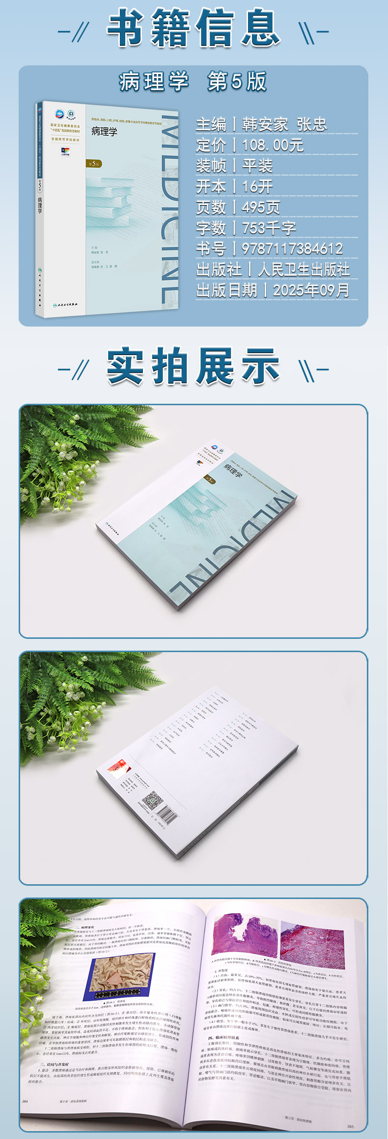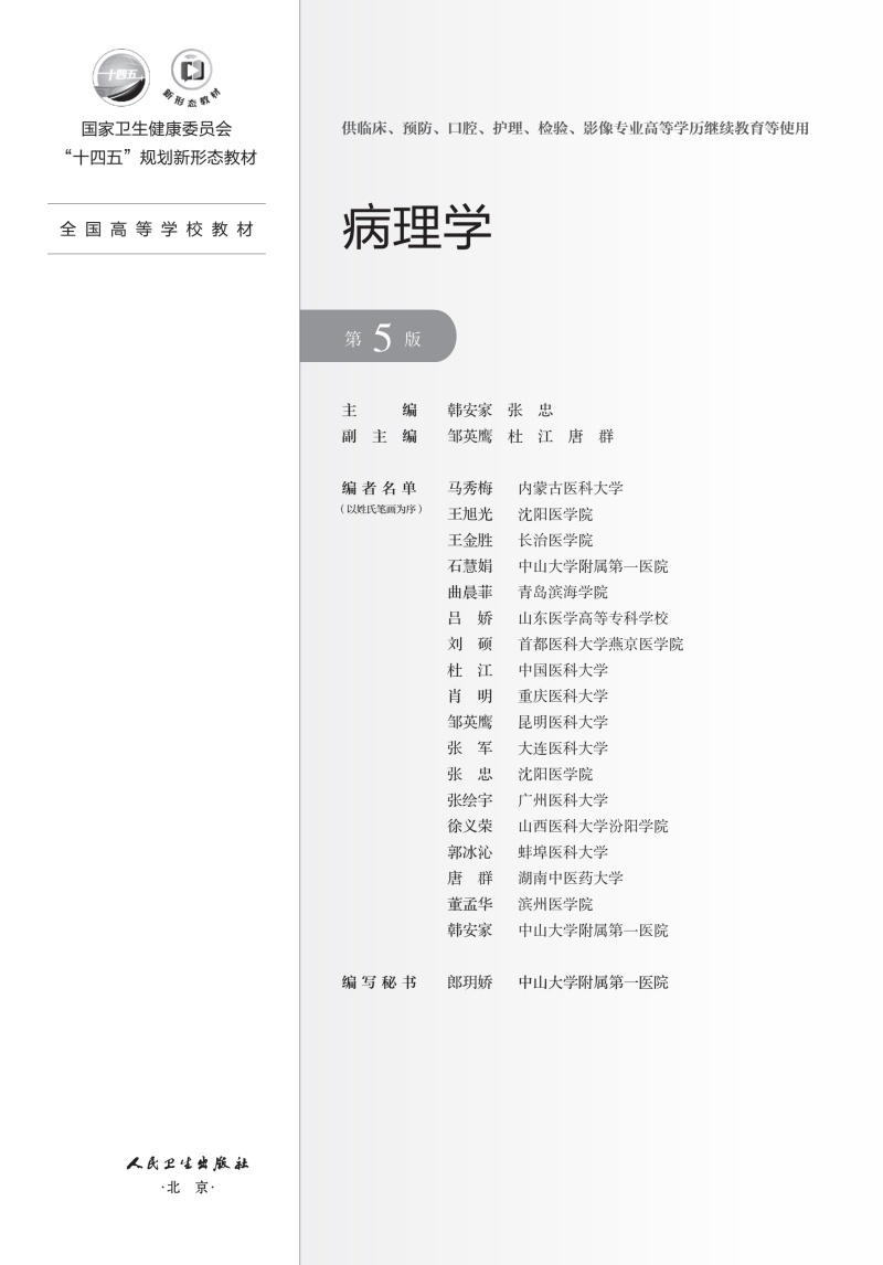 病理学 第5五版 十四五规划新形态教材全国高等学校教材 韩安家 张忠 主编 供临床影像专业高等学历继续教育等使用 人民卫生出版社