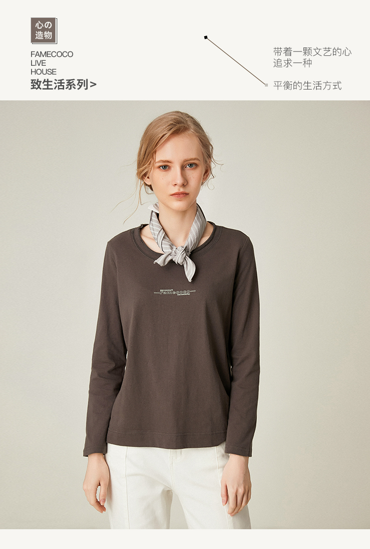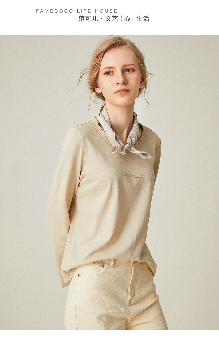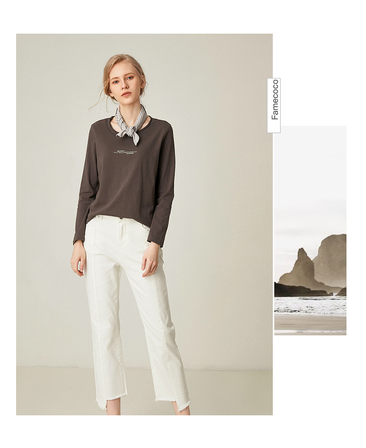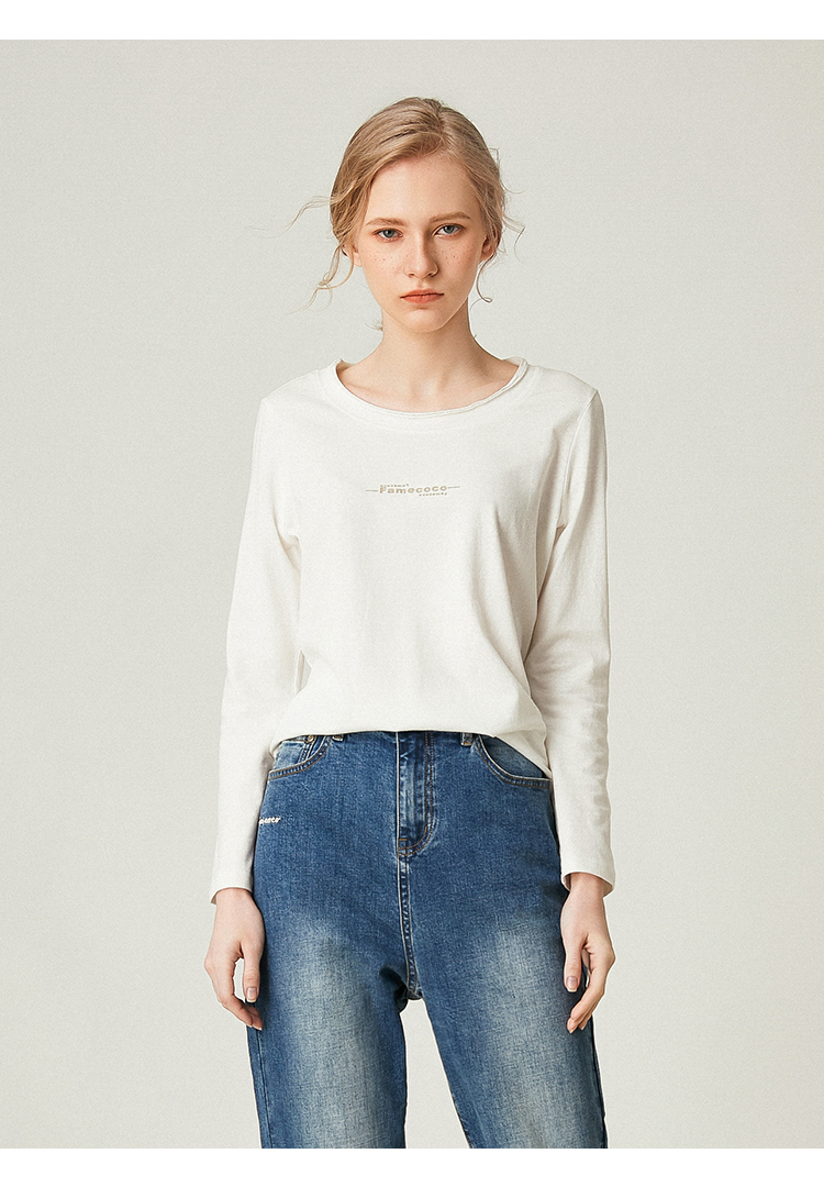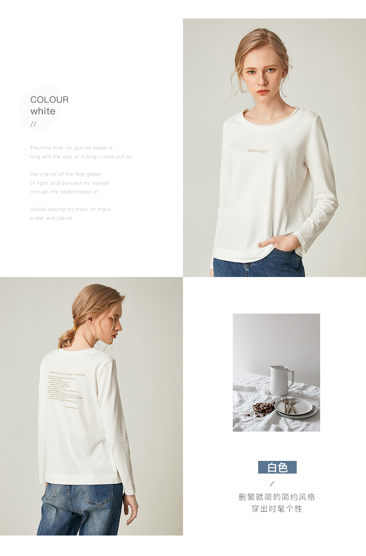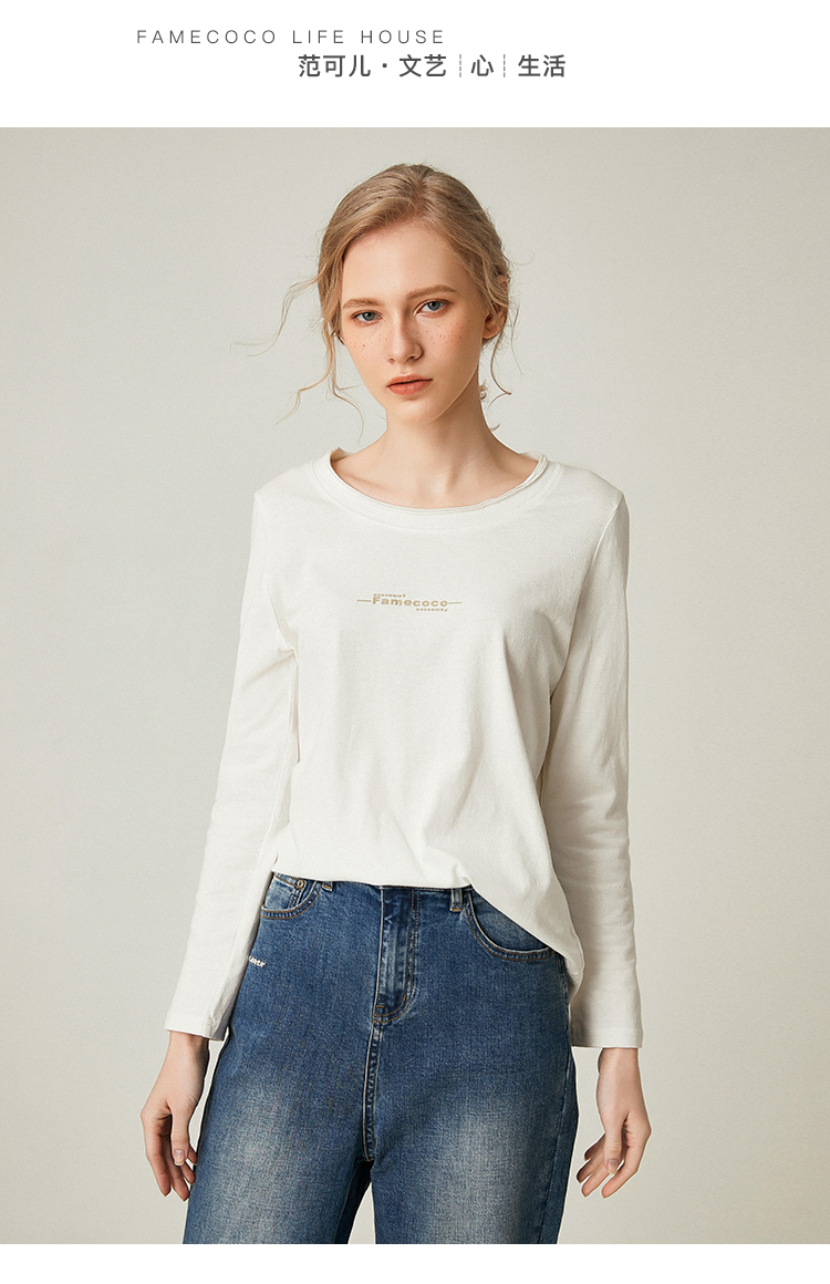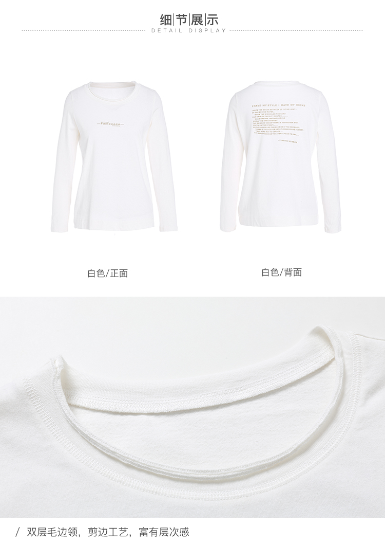 famecoco范可儿全棉t恤长袖白色纯棉圆领字母打底上衣F191BB011