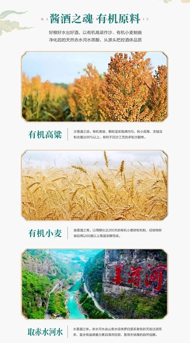 严选有机原料,取自有机红缨子糯高粱基地(获中国有机认证),有机高粱种植过程不使用任何化学性农药化肥除草剂等,亩产仅300斤,粒小皮厚,有机小麦,单宁含量丰富,成就酱酒骨架。