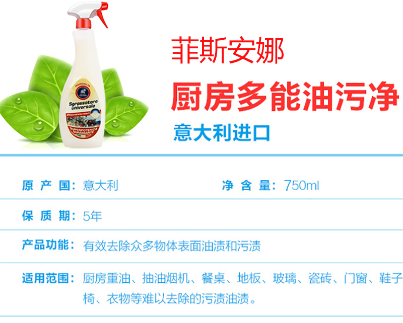 【中欧班列精选】意大利LUCE AZZURRO菲斯安娜多功能油污净 原装进口厨房多功能油烟机油污净 750ML/瓶