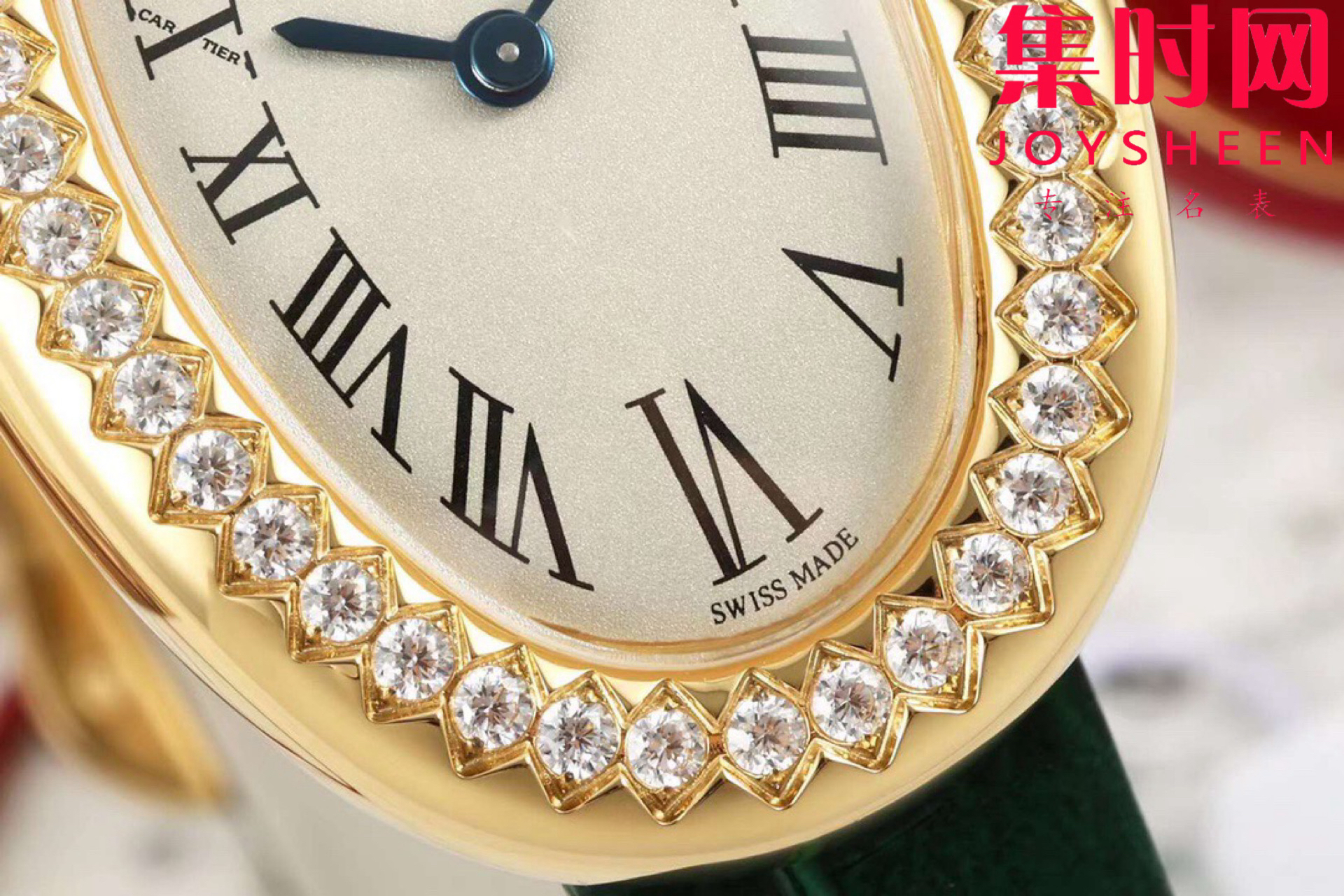 BAIGNOIRE腕表,镶钻款/光圈款可供选择,椭圆形表壳镶嵌42颗明亮式切割圆钻,3字位圆珠形表冠镶嵌1颗凸圆形闪钻,瑞士石英机芯、镀银表盘,表盘搭配罗马数字时标;剑形蓝钢指针,弧形蓝宝石水晶镜面,细节之处,精美绝伦!