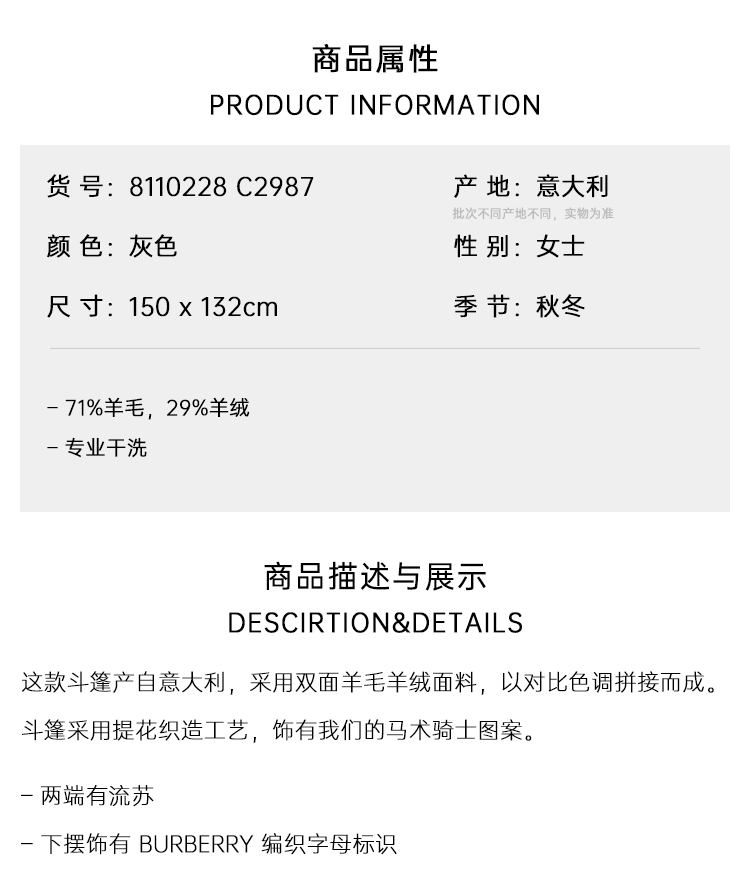 BURBERRY 巴宝莉 女士马术骑士羊毛羊绒披肩 灰色 8110228 C2987