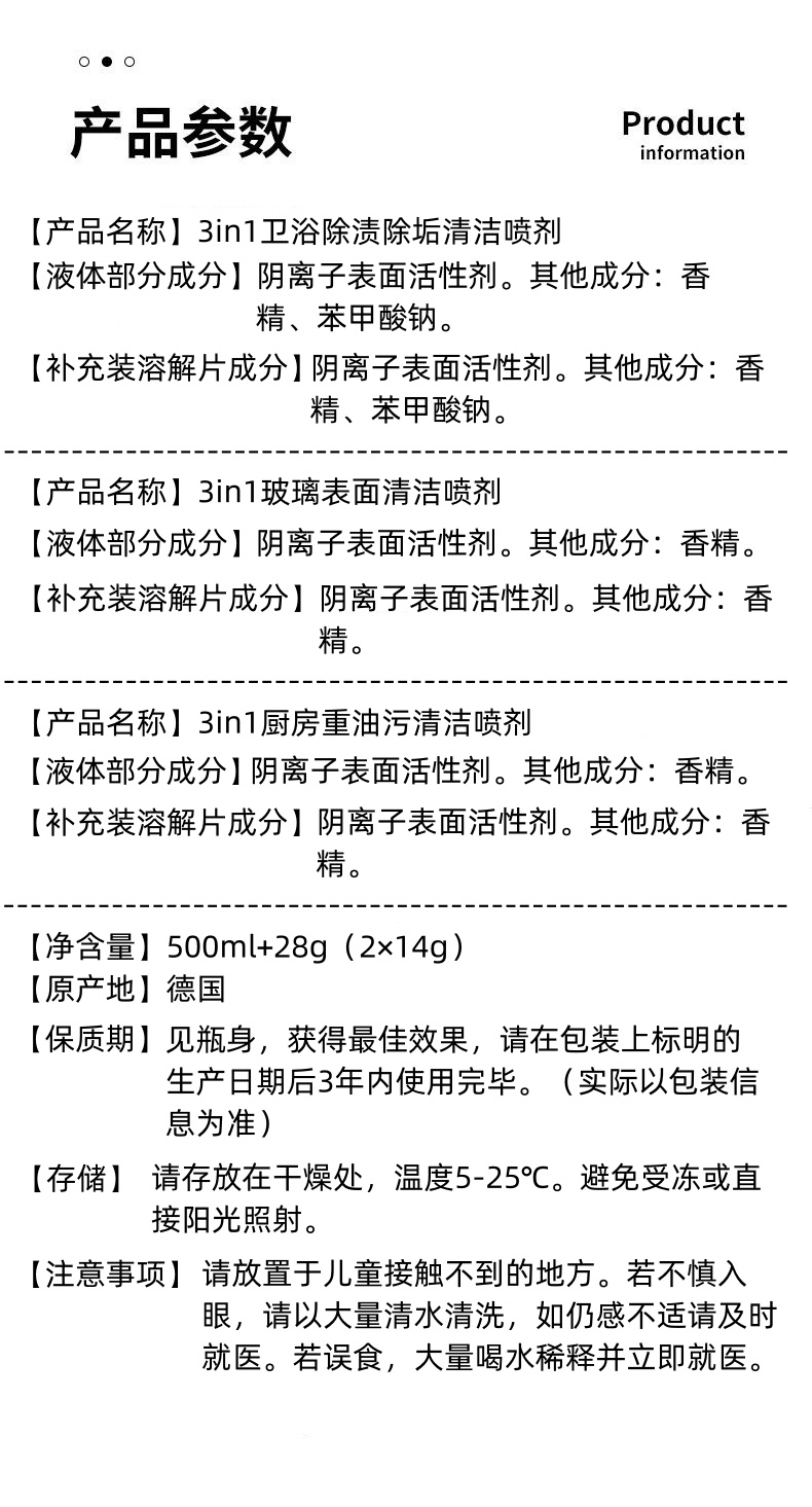 德国进口卫丫3in1卫浴除渍除垢丨厨房重油污丨玻璃表面清洁喷剂500ml+28g