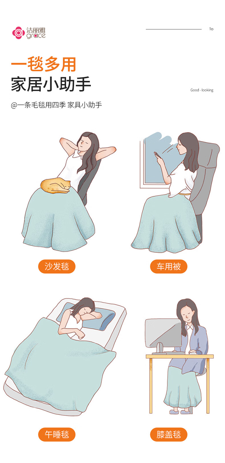 【分仓直发包邮】洁丽雅多功能午睡毯-浅岚JLY-YH706