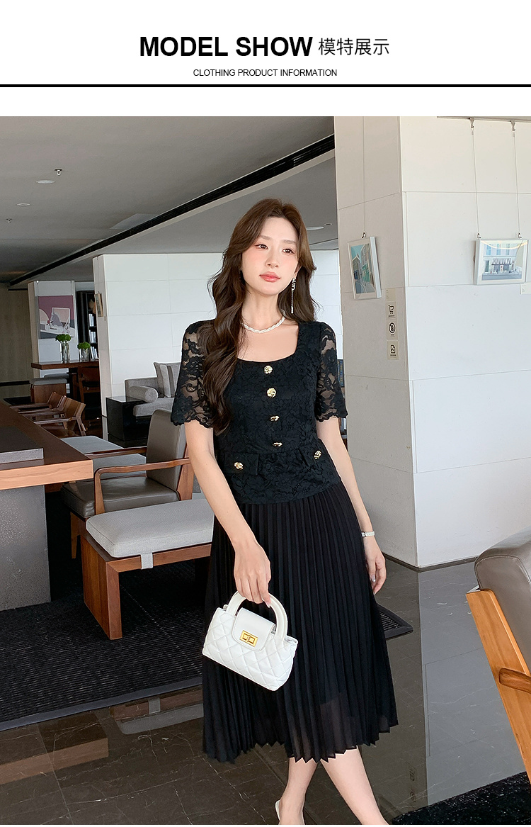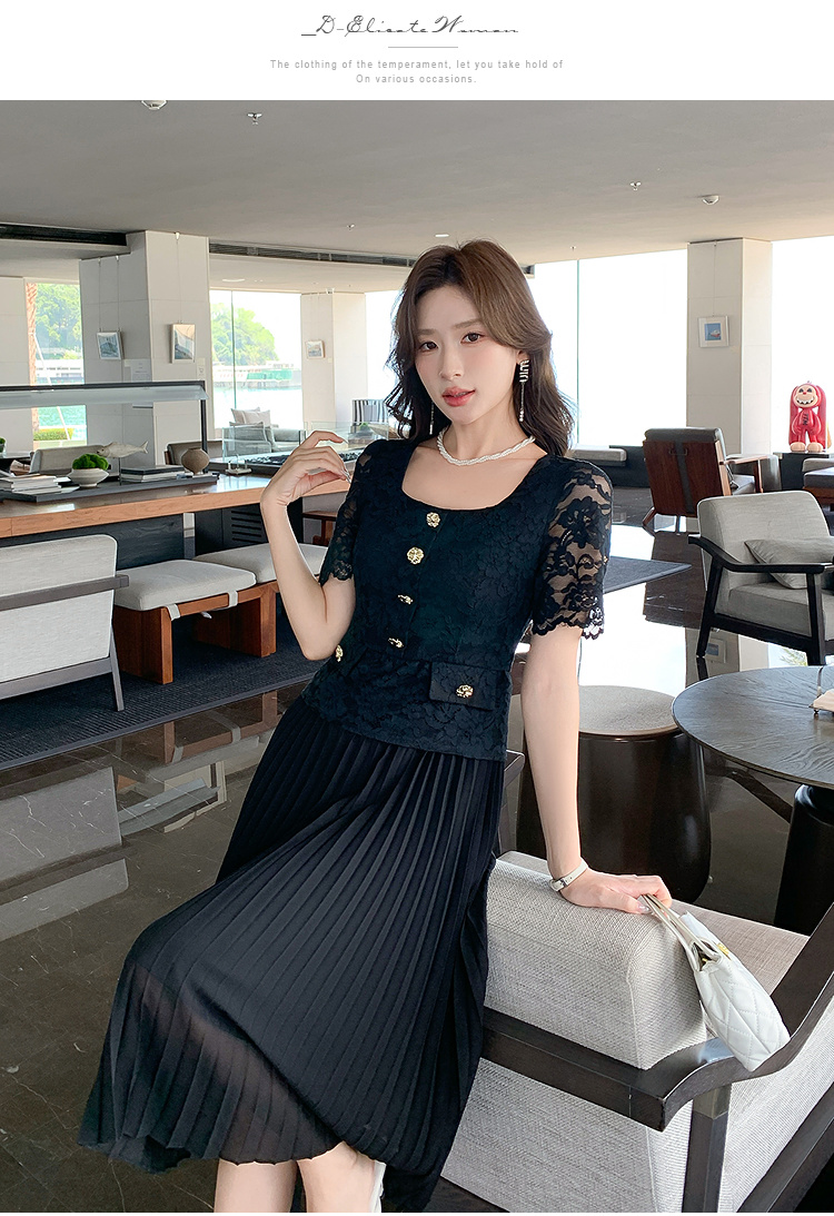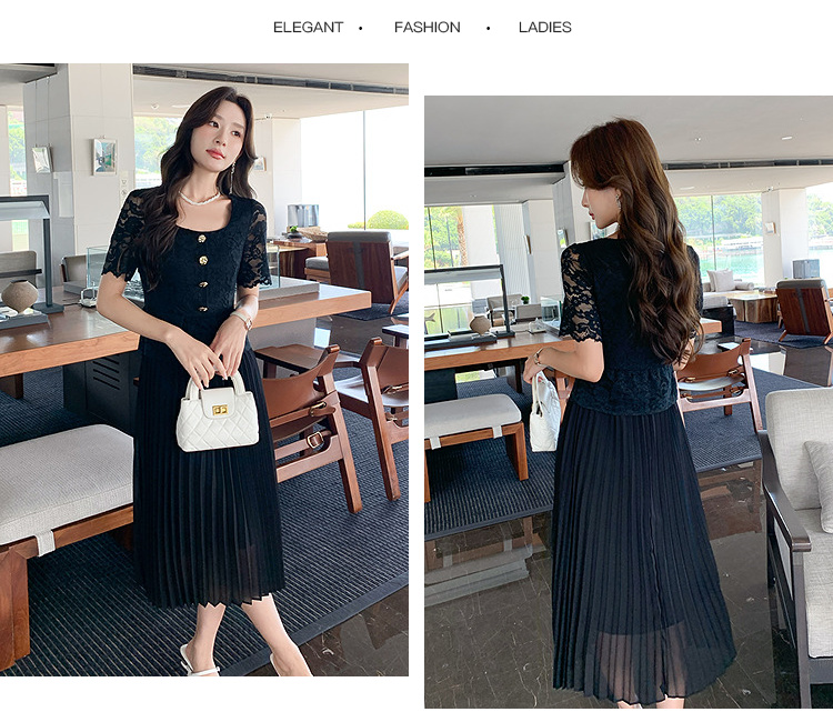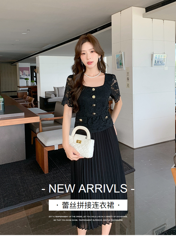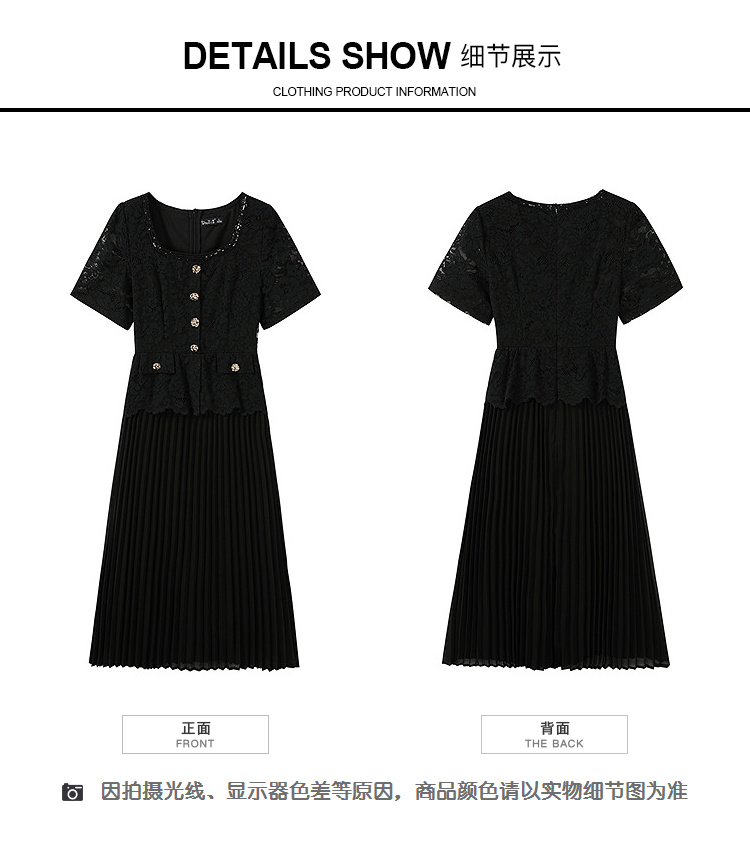 【清仓超15天不保价】奢姿大码女装2025夏季蕾丝拼接百褶气质连衣裙胖妹妹时尚方领裙子9952853128【1】
