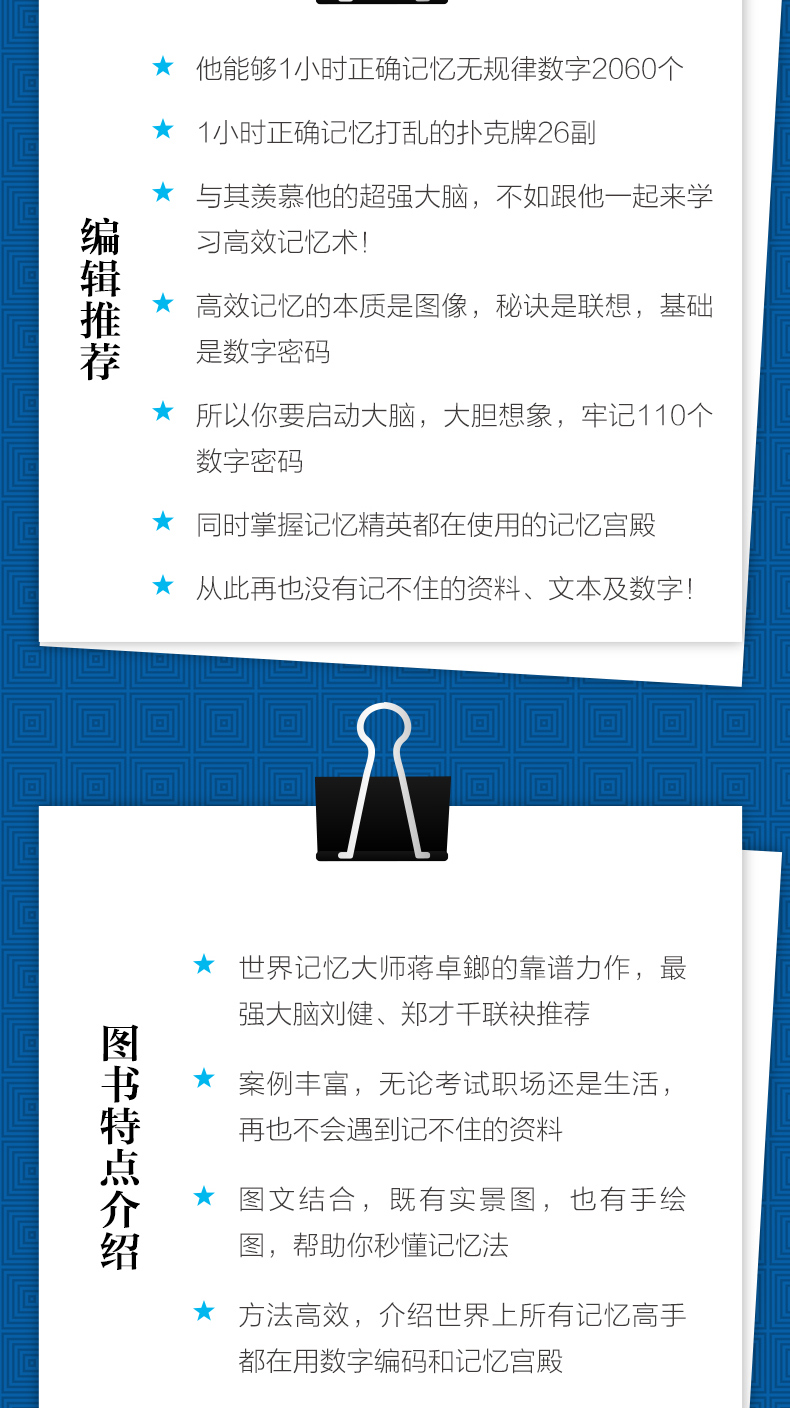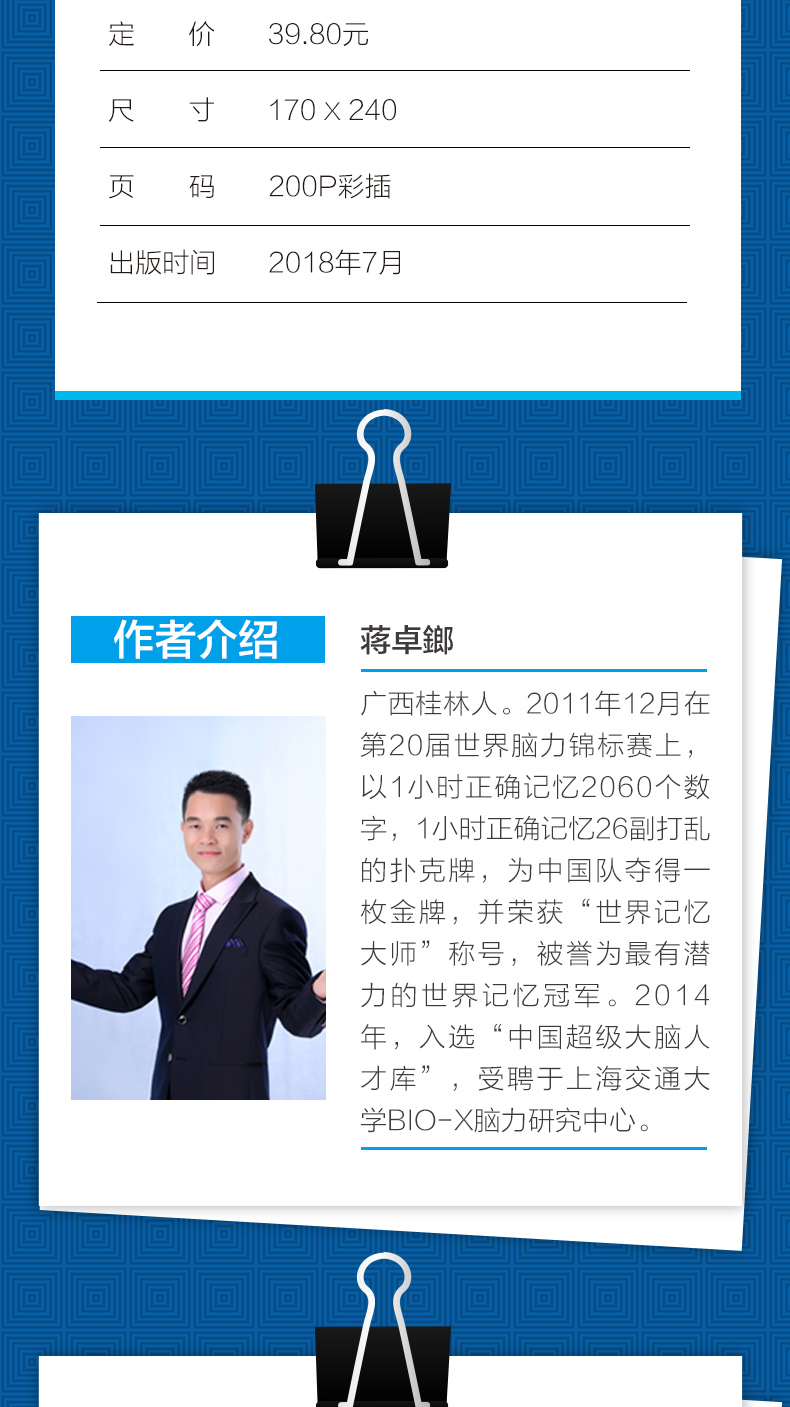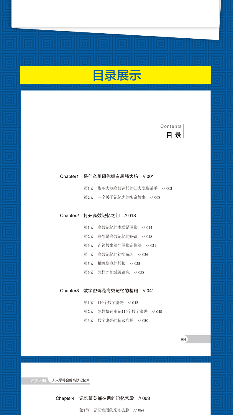 Chapter1 是什么阻碍你拥有大脑 // 001节 影响大脑高效运转的杀手 // 002第2节 一个关于记忆力的离奇故事 // 008Chapter2 打开高效记忆之门 // 013节 高效记忆的本质是图像 // 014第2节 联想是高效记忆的秘诀 // 018第3节 连锁故事法与图像定位法 // 021第4节 高效记忆的初步练习 // 026第5节 抽象信息的转换 // 035第6节 怎样才能缓遗忘 // 038Chapter3 数字密码是高效记忆的基础 // 041节 1个数字密码 // 042第2节 怎样快速牢记1个数字密码 // 048第3节 数字密码的应用 // 050Chapter4 记忆精英都在用的记忆宫殿 // 063节 记忆宫殿的来龙去脉 // 064第2节 手把手教你打造小型记忆宫殿 // 068第3节 怎样构建大规模的记忆宫殿 // 075第4节 打造记忆宫殿的个技巧 // 080第5节 记忆宫殿让古文天书无限量存进你的大脑 // 084第6节 记忆宫殿的神奇拓展 // 094Chapter5 快速扑克记忆 // 1节 扑克牌是提高记忆好工具 // 2第2节 扑克牌训练方法 // 4Chapter6 高效记忆法的实践运用 // 9节 学习运用之英语单词 // 1第2节 学习运用之历史事件 // 116第3节 学习运用之元素周期表 // 119第4节 学习运用之地图记忆 // 124第5节 学习运用之数理公式 // 126第6节 生活运用之人肉照相机 // 130第7节 生活运用之风云 // 134第8节 生活运用之名人演讲与听记歌词 // 137第9节 生活运用之路痴找路 // 141第节 生活运用之买菜回家 // 144Chapter 7 一起进军世界脑力锦标赛 // 147节 一分钟了解世界脑力锦标赛 // 148第2节 世界脑力锦标赛之抽象图形 // 150第3节 世界脑力锦标赛之二进制数字 // 153第4节 世界脑力锦标赛之马拉松数字 // 156第5节 世界脑力锦标赛之人名头像 // 159第6节 世界脑力锦标赛之快速数字 // 162第7节 世界脑力锦标赛之历史事件 // 164第8节 世界脑力锦标赛之一小时扑克牌 // 169第9节 世界脑力锦标赛之词汇 // 171第节 世界脑力锦标赛之听记数字 // 1751节 世界脑力锦标赛之快速扑克 // 1772节 我和世界脑力锦标赛的故事 // 179附录:圆周率00位 // 185