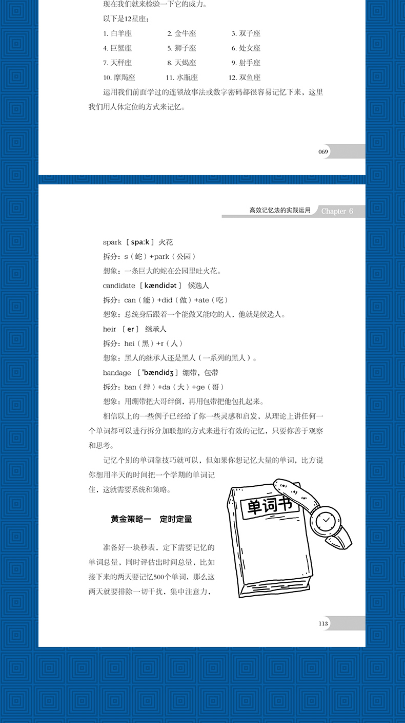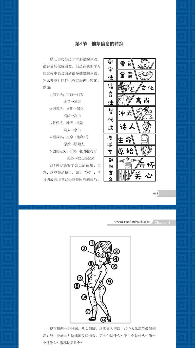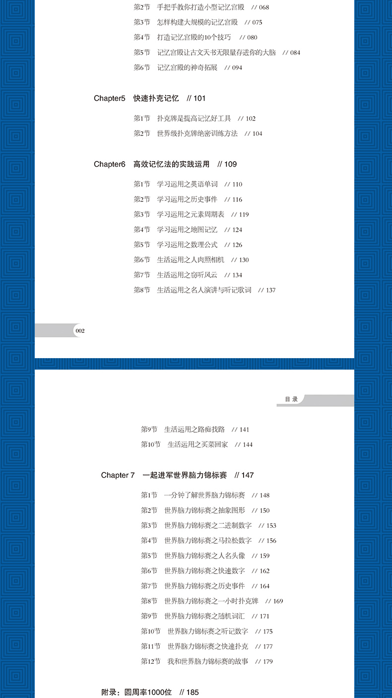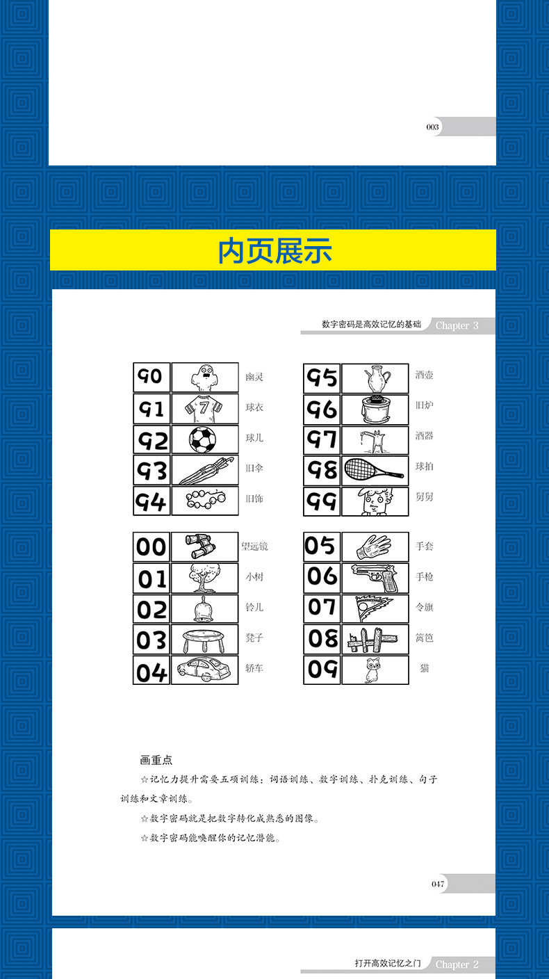 Chapter1 是什么阻碍你拥有大脑 // 001节 影响大脑高效运转的杀手 // 002第2节 一个关于记忆力的离奇故事 // 008Chapter2 打开高效记忆之门 // 013节 高效记忆的本质是图像 // 014第2节 联想是高效记忆的秘诀 // 018第3节 连锁故事法与图像定位法 // 021第4节 高效记忆的初步练习 // 026第5节 抽象信息的转换 // 035第6节 怎样才能缓遗忘 // 038Chapter3 数字密码是高效记忆的基础 // 041节 1个数字密码 // 042第2节 怎样快速牢记1个数字密码 // 048第3节 数字密码的应用 // 050Chapter4 记忆精英都在用的记忆宫殿 // 063节 记忆宫殿的来龙去脉 // 064第2节 手把手教你打造小型记忆宫殿 // 068第3节 怎样构建大规模的记忆宫殿 // 075第4节 打造记忆宫殿的个技巧 // 080第5节 记忆宫殿让古文天书无限量存进你的大脑 // 084第6节 记忆宫殿的神奇拓展 // 094Chapter5 快速扑克记忆 // 1节 扑克牌是提高记忆好工具 // 2第2节 扑克牌训练方法 // 4Chapter6 高效记忆法的实践运用 // 9节 学习运用之英语单词 // 1第2节 学习运用之历史事件 // 116第3节 学习运用之元素周期表 // 119第4节 学习运用之地图记忆 // 124第5节 学习运用之数理公式 // 126第6节 生活运用之人肉照相机 // 130第7节 生活运用之风云 // 134第8节 生活运用之名人演讲与听记歌词 // 137第9节 生活运用之路痴找路 // 141第节 生活运用之买菜回家 // 144Chapter 7 一起进军世界脑力锦标赛 // 147节 一分钟了解世界脑力锦标赛 // 148第2节 世界脑力锦标赛之抽象图形 // 150第3节 世界脑力锦标赛之二进制数字 // 153第4节 世界脑力锦标赛之马拉松数字 // 156第5节 世界脑力锦标赛之人名头像 // 159第6节 世界脑力锦标赛之快速数字 // 162第7节 世界脑力锦标赛之历史事件 // 164第8节 世界脑力锦标赛之一小时扑克牌 // 169第9节 世界脑力锦标赛之词汇 // 171第节 世界脑力锦标赛之听记数字 // 1751节 世界脑力锦标赛之快速扑克 // 1772节 我和世界脑力锦标赛的故事 // 179附录:圆周率00位 // 185