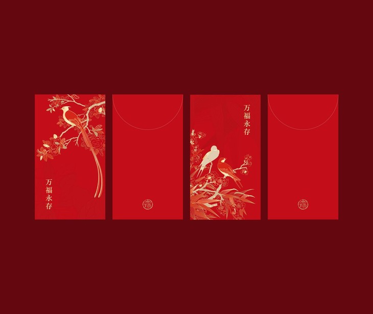 万福永存红包六枚。选取供奉内廷的画家余稺所绘《石榴寿带》和《桃花春燕》两幅清新花鸟画为题材,图案烫金。有春到人间福寿长久、永享幸福之意。