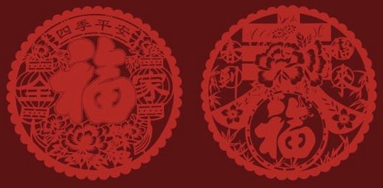 大福字一张,小福字四张,寓意五福临门。福字取自为乾隆皇帝御笔手书墨迹,采用印金底纹。