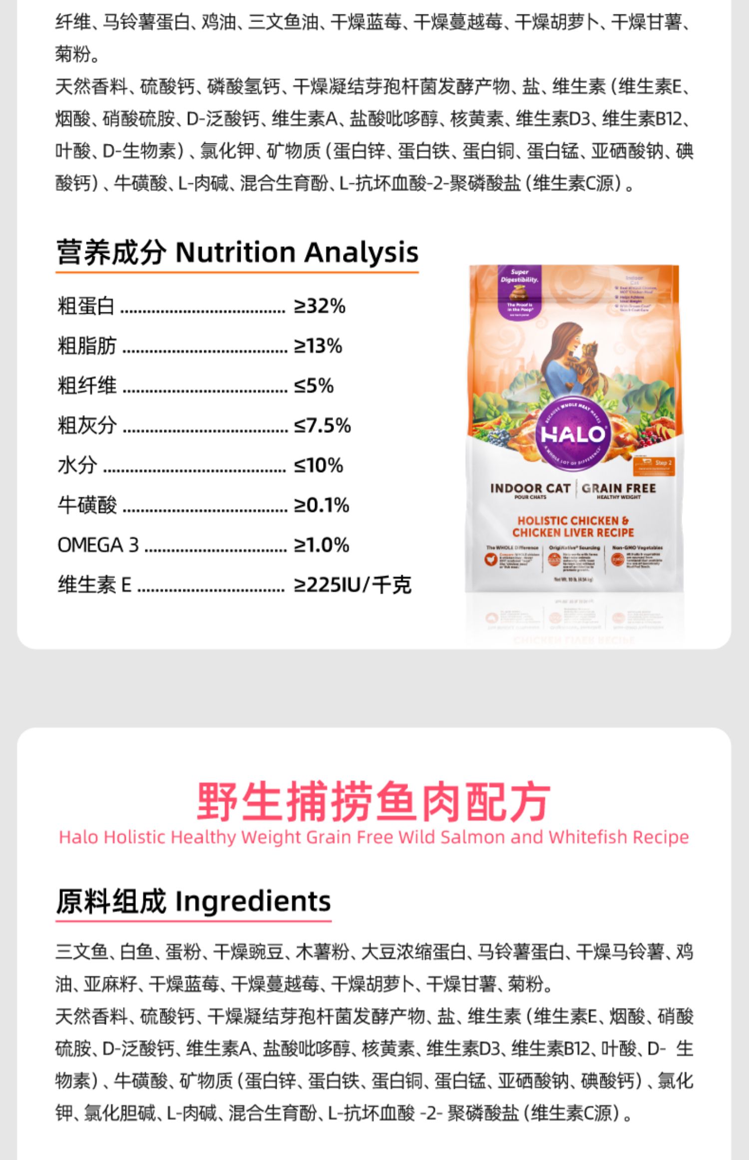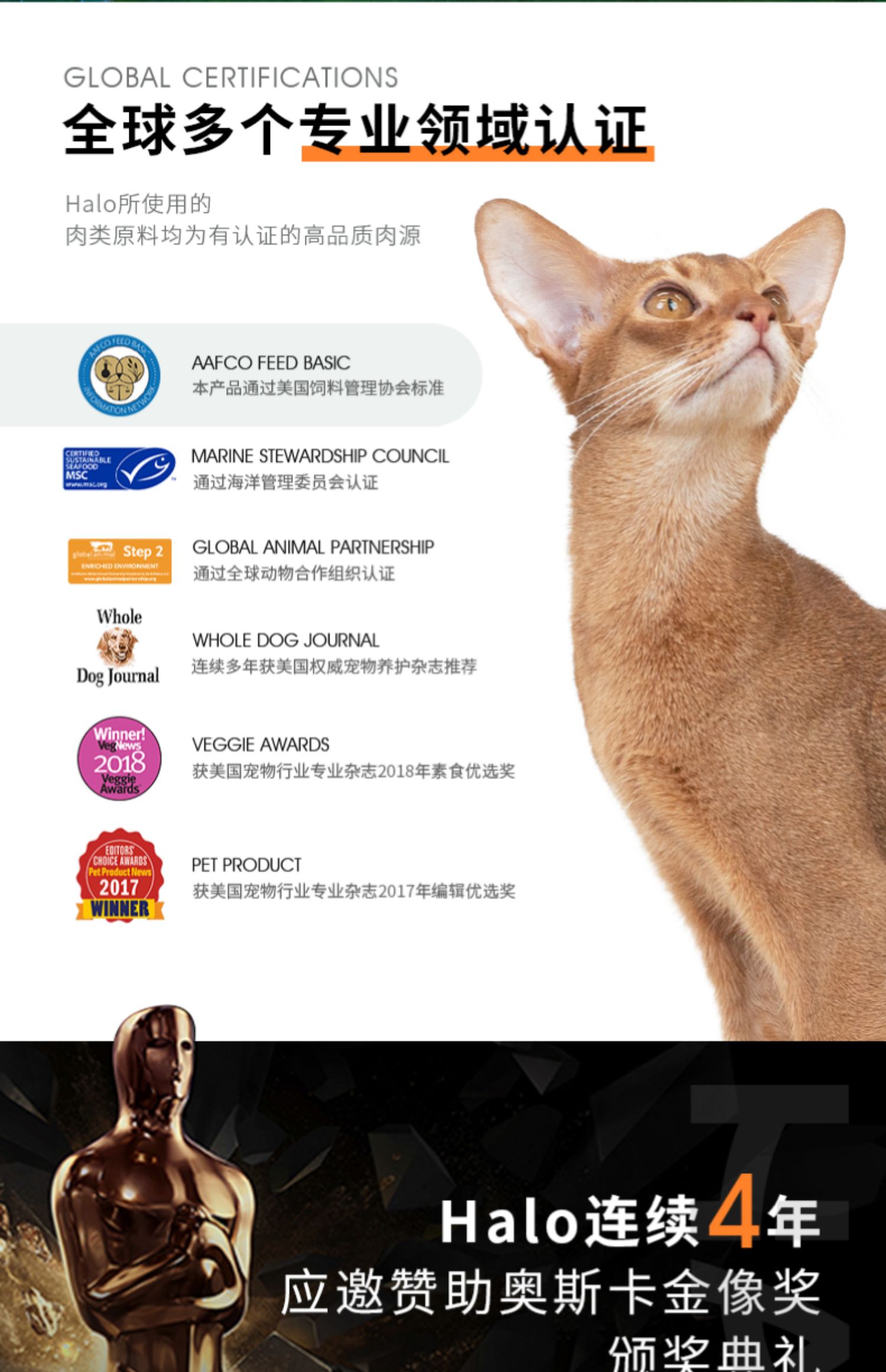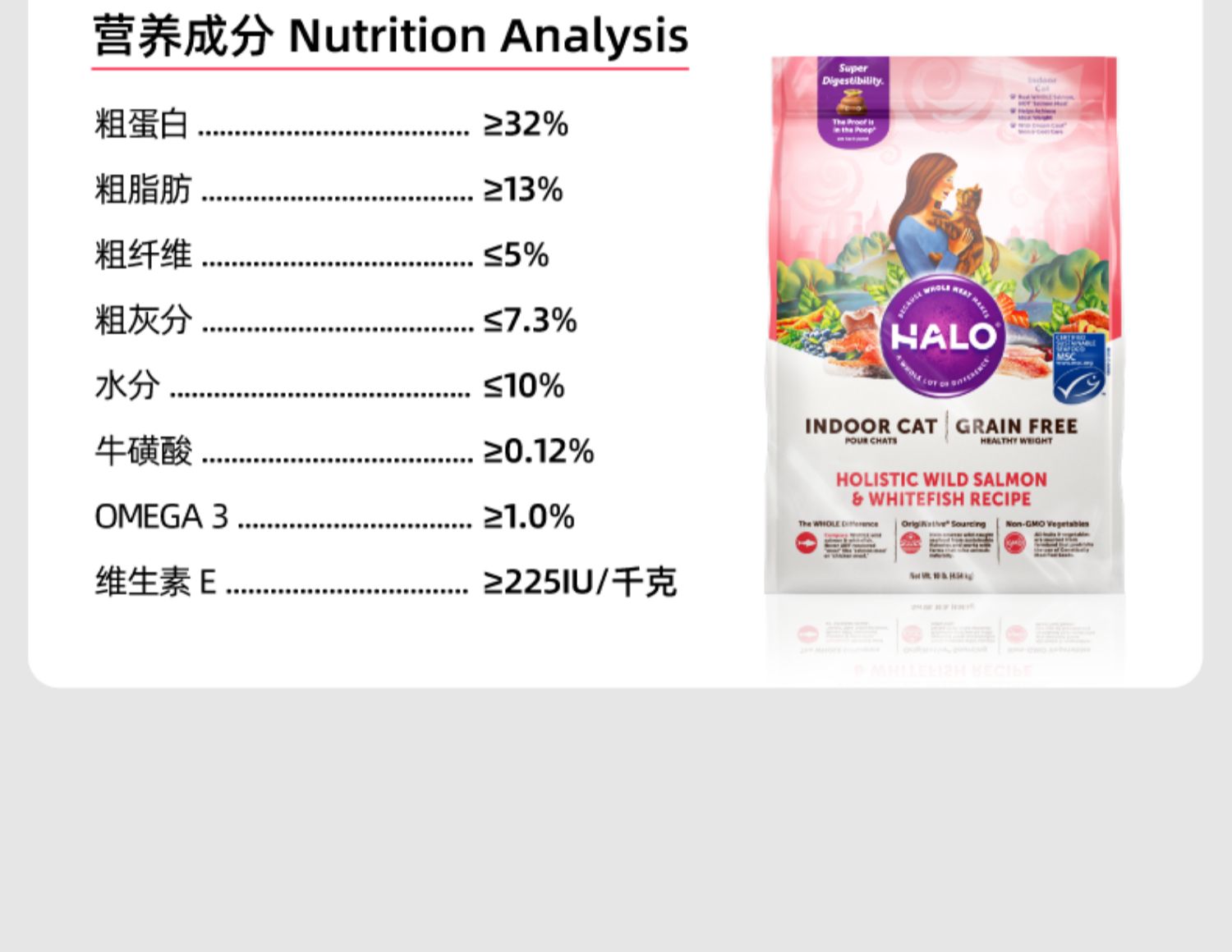Halo自然光环纯鲜肉成猫幼猫低卡健美鸡肉鱼肉味美毛猫粮10磅/4.5kg