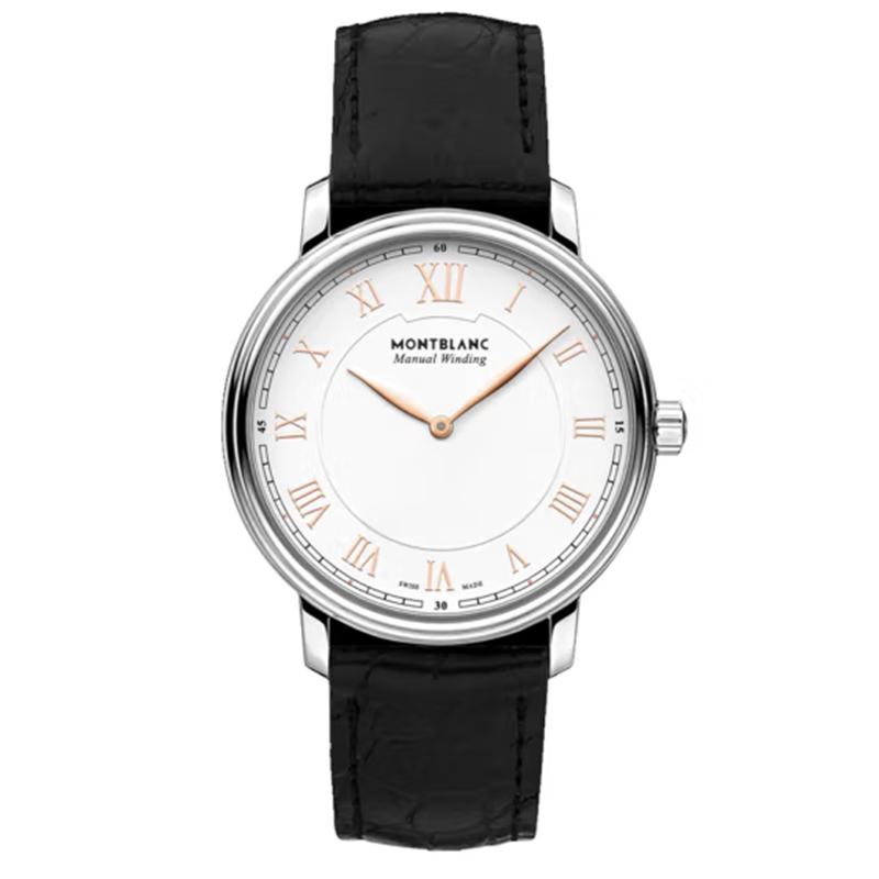 镜面 材质 | 穹形蓝宝石水晶玻璃表镜,防反射涂层 | 表盘 | 精钢表壳 白色表盘,玫瑰金罗马数字时标 |