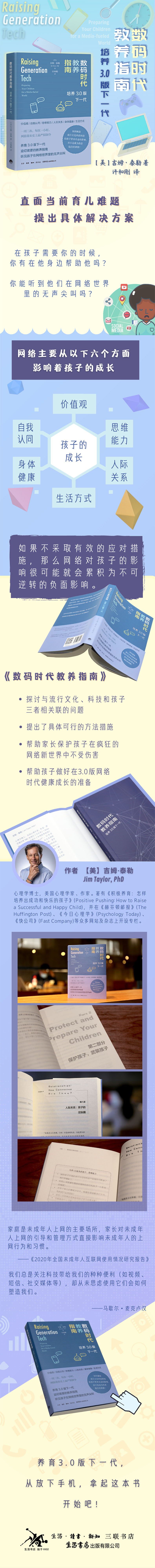 编辑推荐 一位妈妈曾经抱怨:“从我的孩子离开我去幼儿园开始,我每天都在担心,担心他在外面遭遇到什么,而我没有办法在他旁边保护他。” 而现在,一个新的事实是,在现实世界之外还有一个每时每刻都在影响着孩子的数码世界,或者更通俗地说“网络世界”。 在网络世界里,你的孩子正在遭遇什么?在他需要你的时候,你有在他身边帮助他吗? 你能听到他们在网络世界里的无声尖叫吗? 我们的孩子已然是这个网络新世界的“原住民”,同网络世界一起成长。有些孩子沉迷网络游戏,有些孩子一回家就全身心投入到虚拟世界中,但也有些孩子利用网络获取更开阔的视野,有些孩子在网络世界里尽可能地发展自己的爱好…… 如何确保流行文化和高科技给孩子带来有益的影响,而不是成为伤害他们的利器? 《数码时代教养指南:培养3.0版的孩子》回答了这一问题。心理学家吉姆•泰勒博士为数码时代的家长们写下一份详尽的教养指南,与其担心孩子在我们看不到的地方会遭遇什么,不如放下手机,拿起这本书,认识网络世界、采取有效措施,担负起疯狂新世界里作为家长的责任。 内容简介 网络世界究竟有助于孩子的成长,还是会造成负面的干涉?在价值观、自我认同、思维能力、人际关系、身体健康和生活方式六个主要方面,网络正影响着孩子的成长。如果不采取有效的应对措施,那么这种影响很可能就会累积为不可逆转的负面影响。本书通过回顾当下的研究成果、总结相关专业知识和为人父母的经验,在探讨与流行文化、科技和孩子三者相关联的问题的同时,提出了具体可行的方法措施,帮助家长保护孩子在疯狂的网络新世界中不受伤害,帮助孩子做好在3.0版网络时代健康成长的准备。