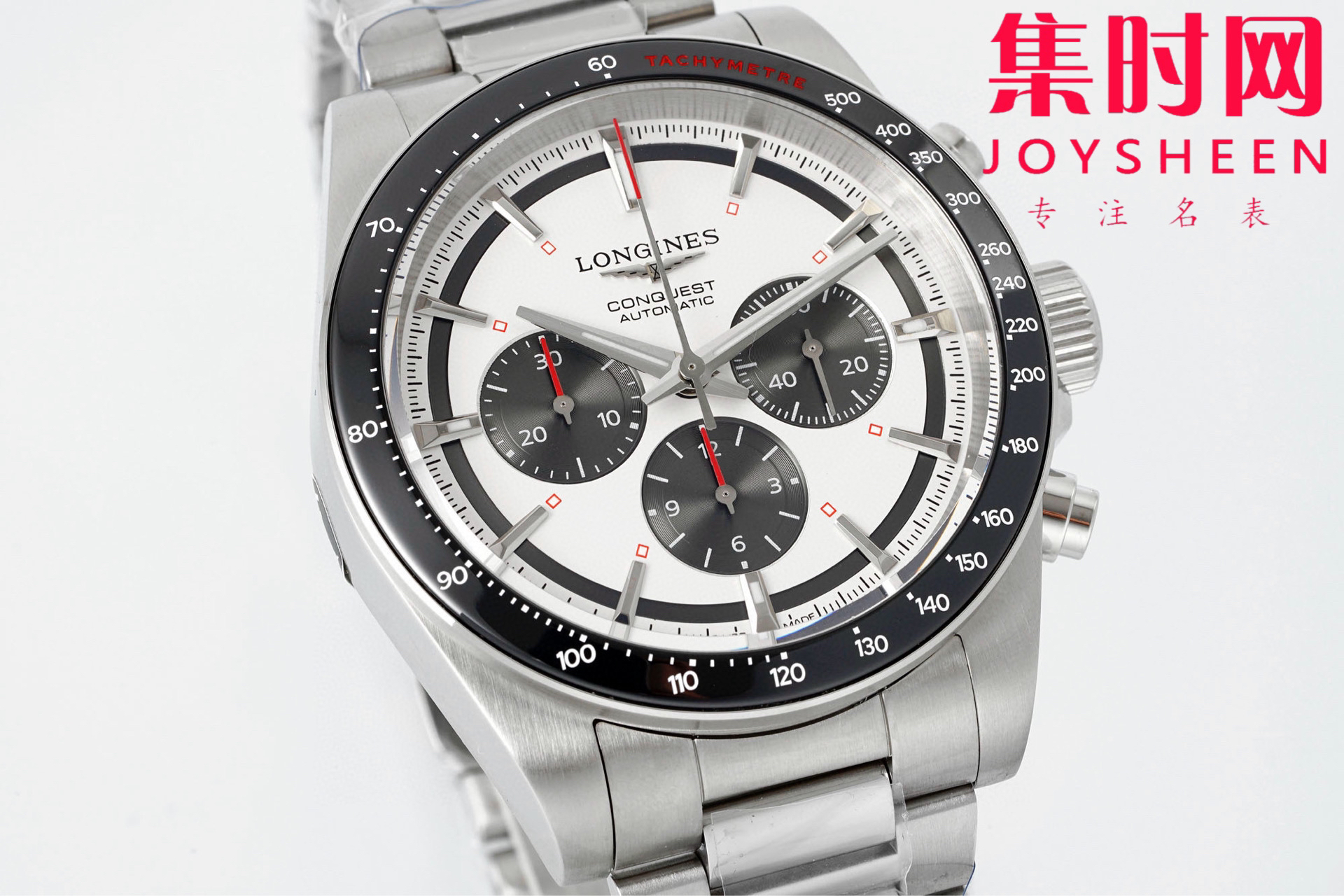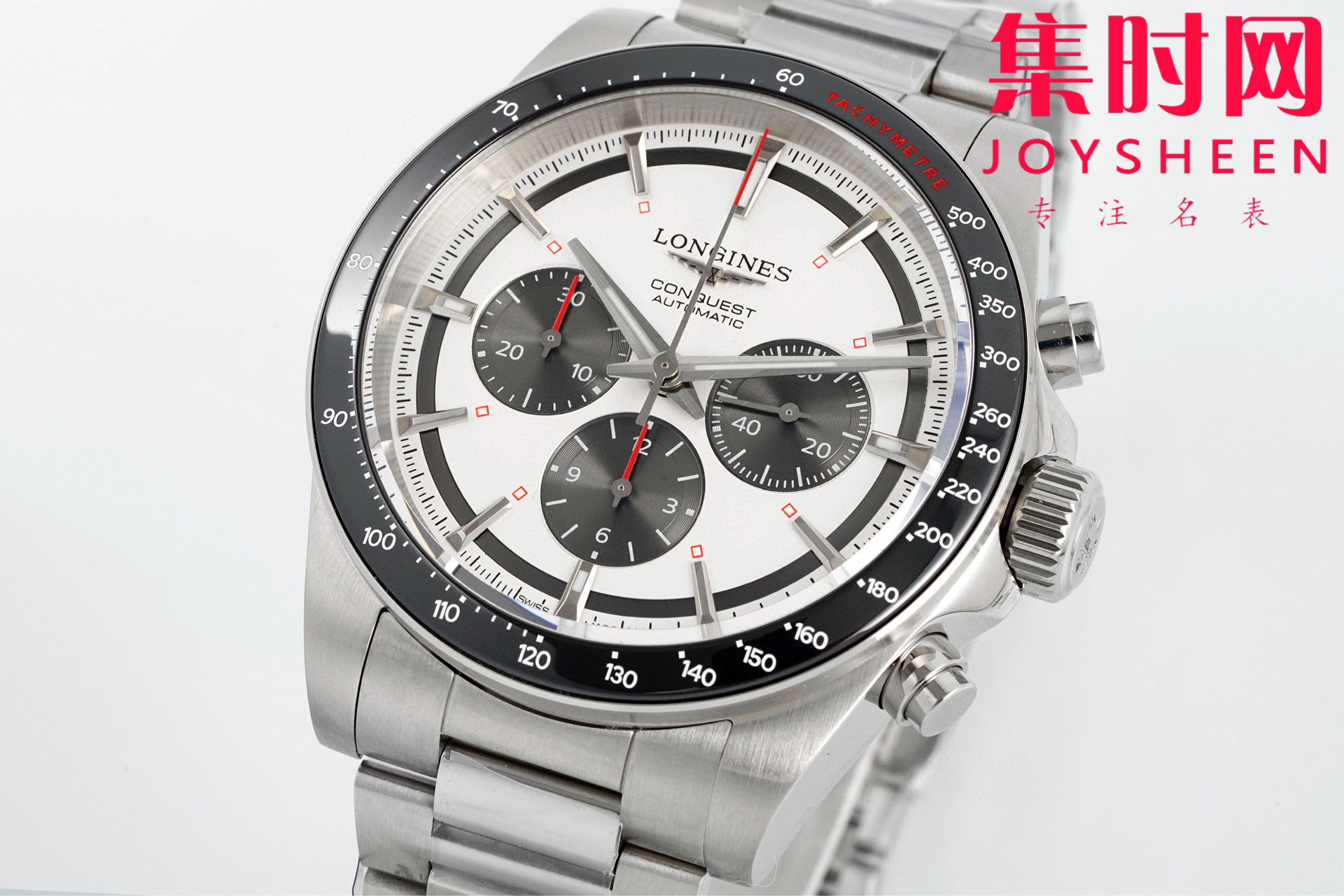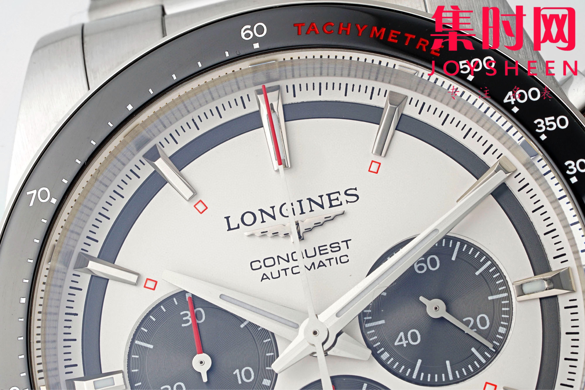 AF浪琴康卡斯计时系列 康卡斯悦动计时 男士腕表 钢带款 表径42mm,使用陶瓷表圈,表圈上有有测速圈,并有红字点缀。