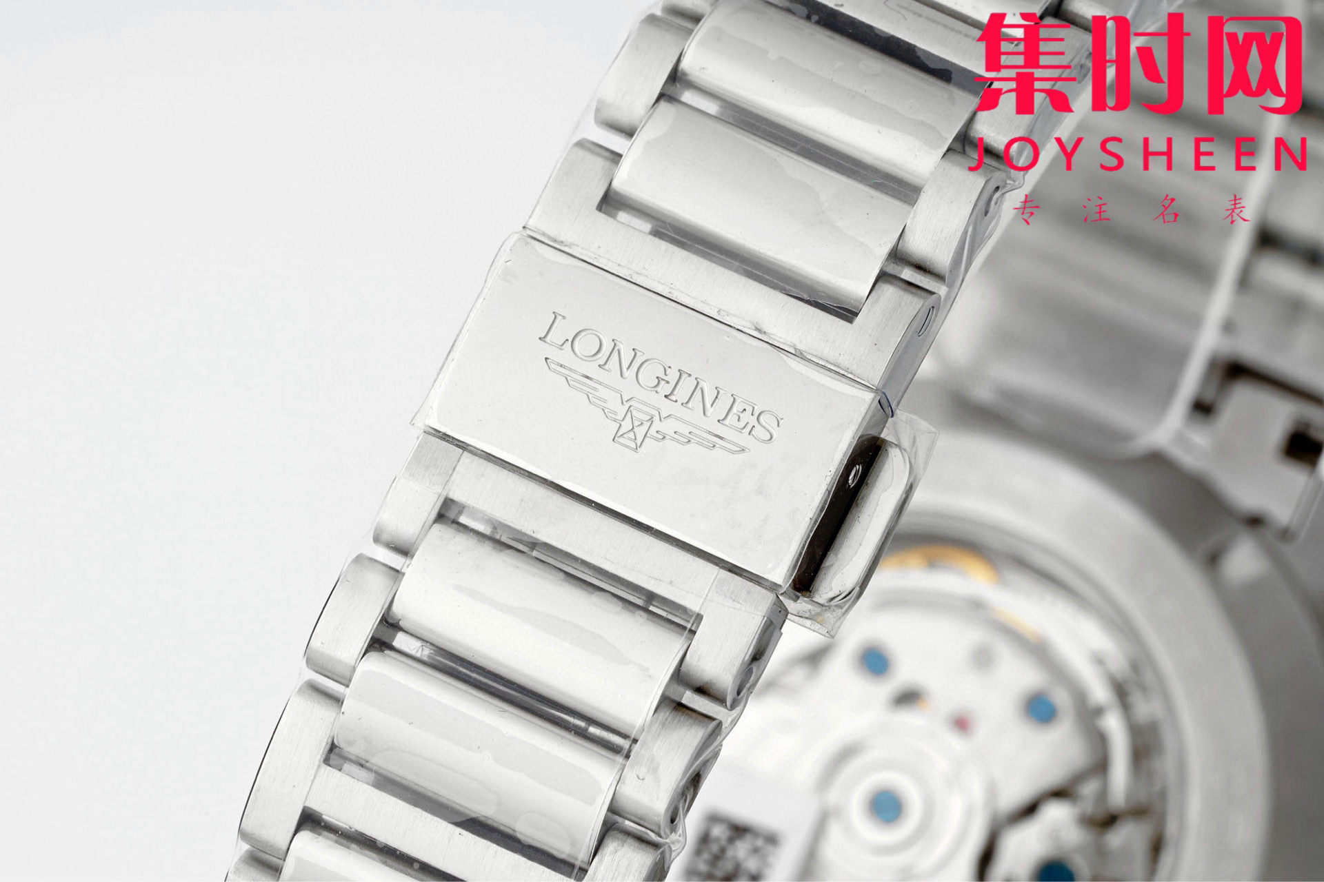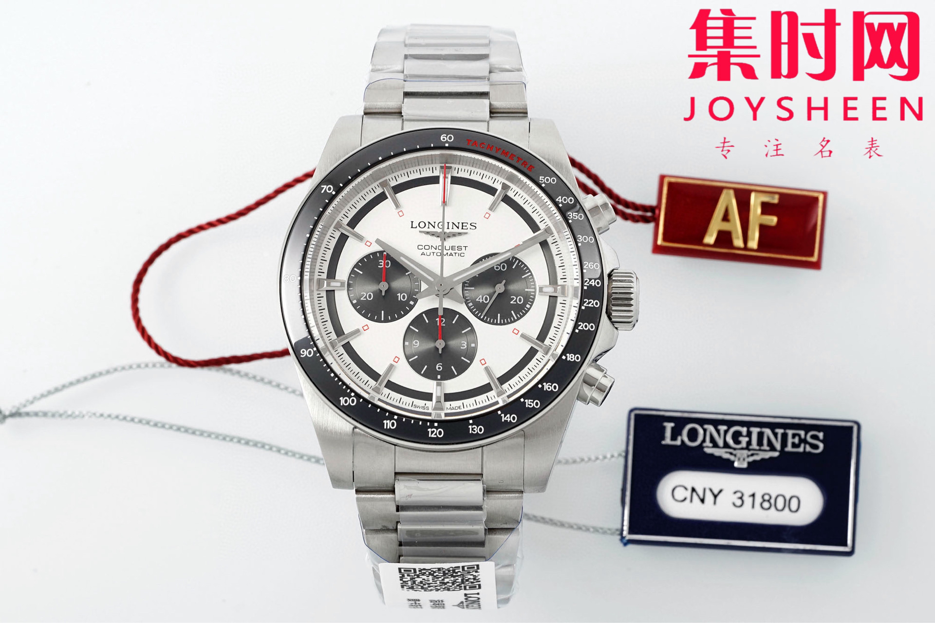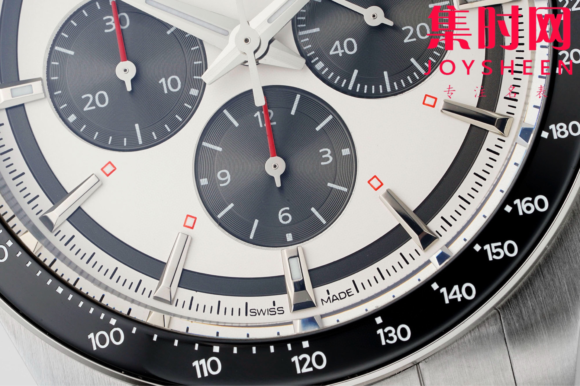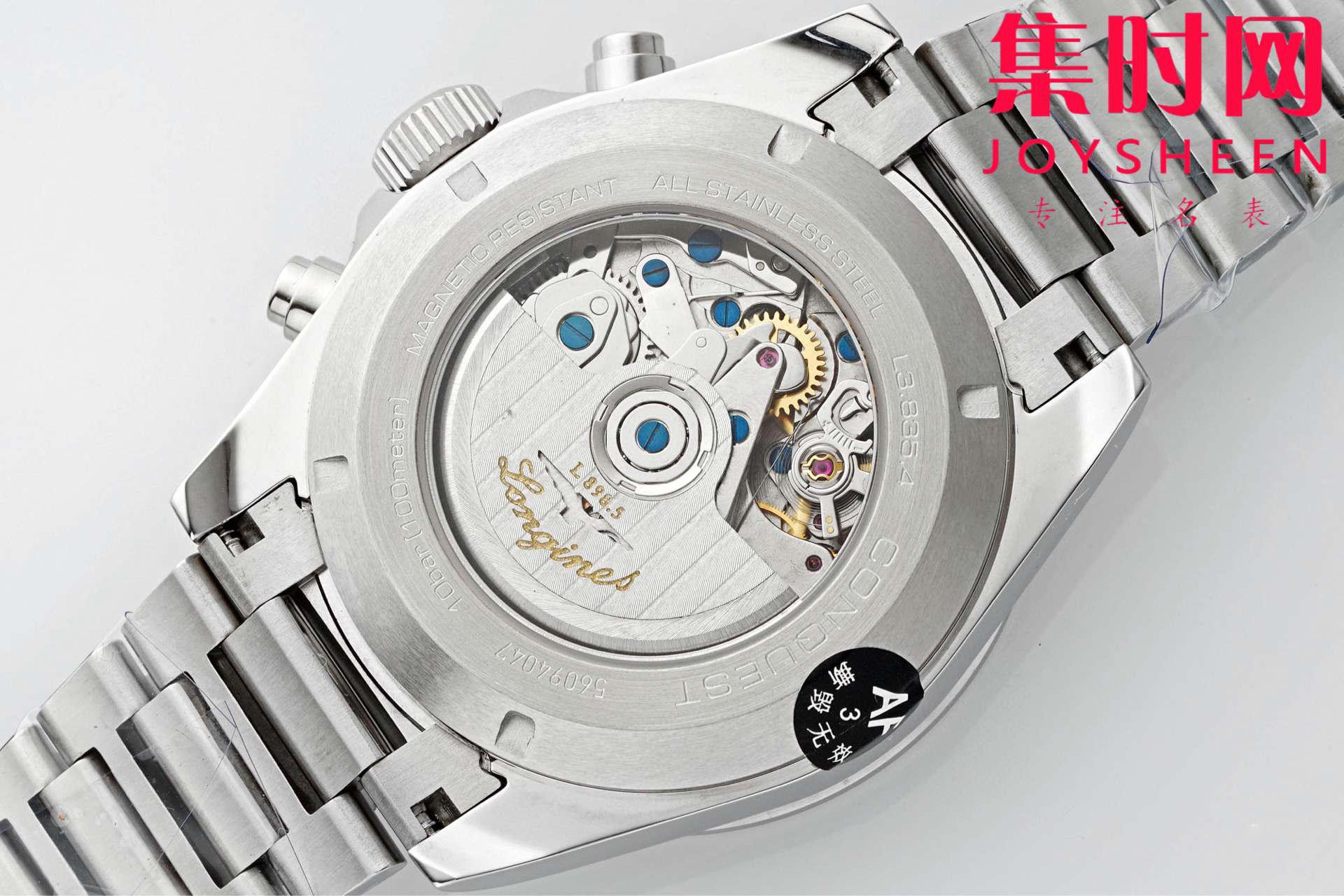 AF浪琴康卡斯计时系列 康卡斯悦动计时 男士腕表 钢带款 表径42mm,使用陶瓷表圈,表圈上有有测速圈,并有红字点缀。