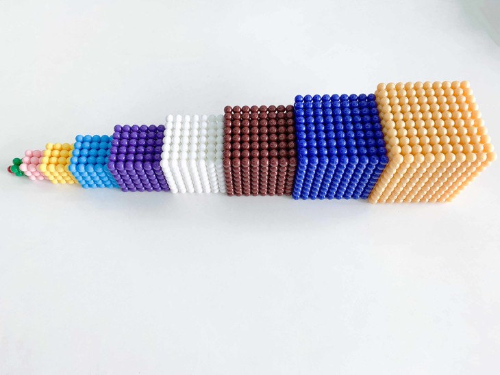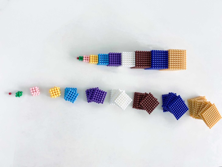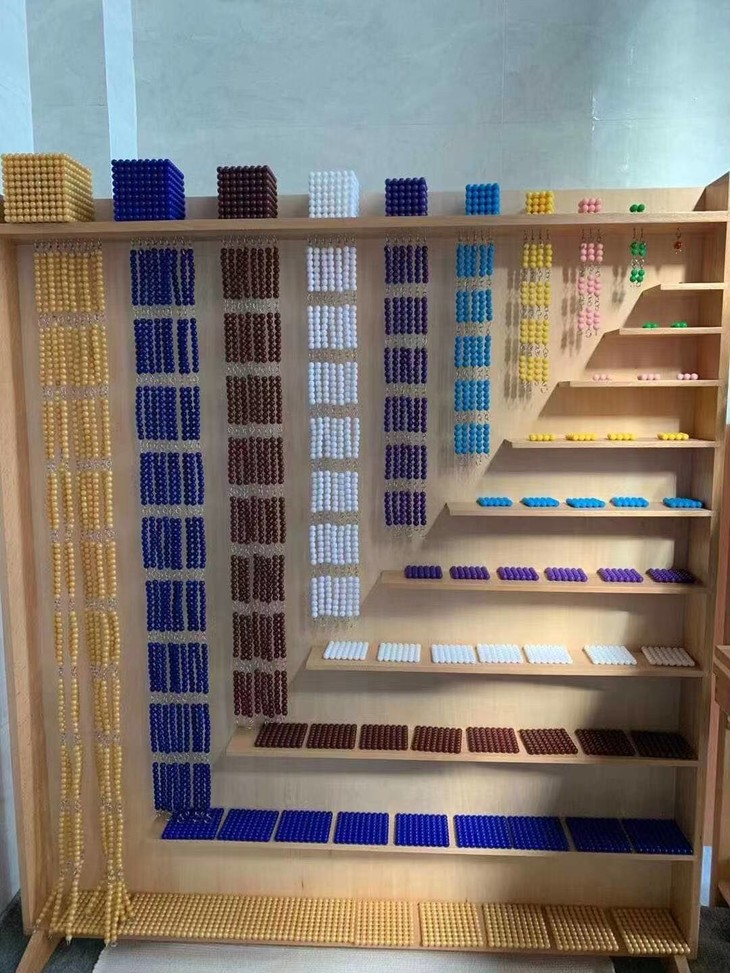 教具构成:一套立方珠链,一套平方珠链,一副木质大框架均为内销版,外加一套国际版配套标签