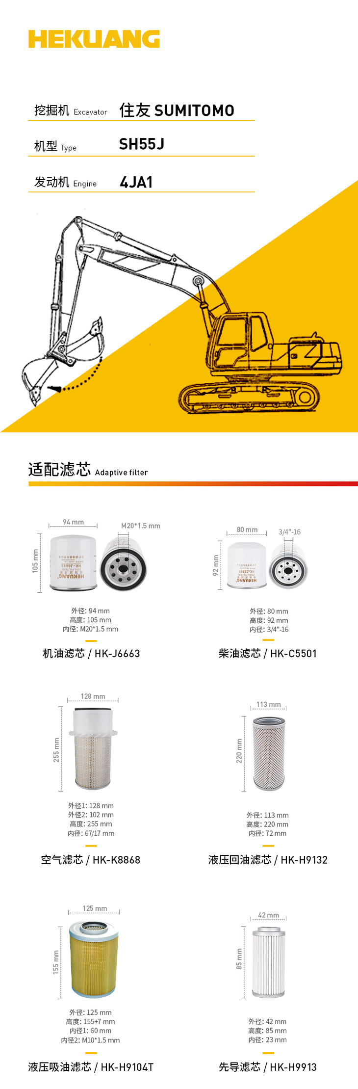 住友SH55J(4JA1)挖掘机滤芯 机油柴油空气滤芯 液压油先导滤芯