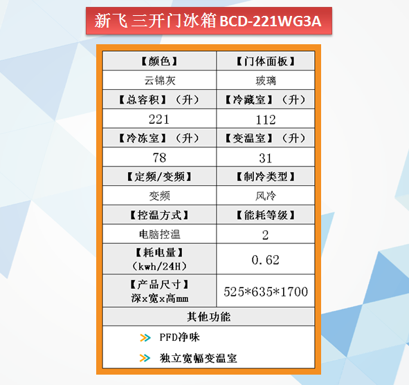新飞 冰箱 BCD-221WG3A 221 三门 三重除菌 云锦灰玻璃面板 风冷 变频 电脑控温