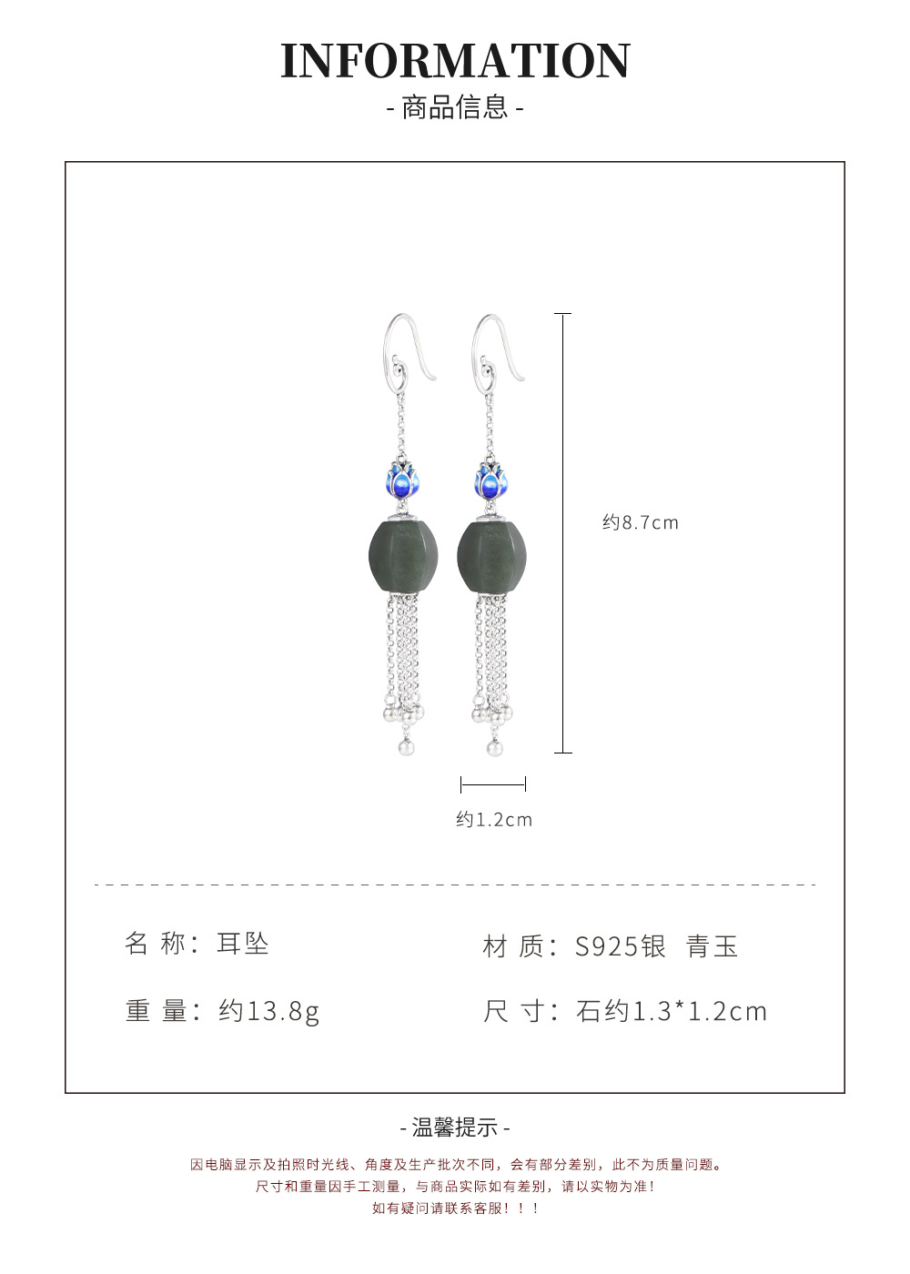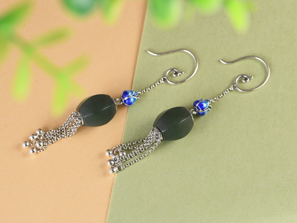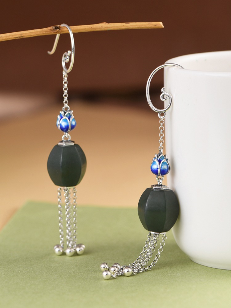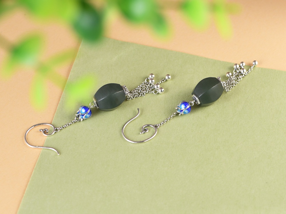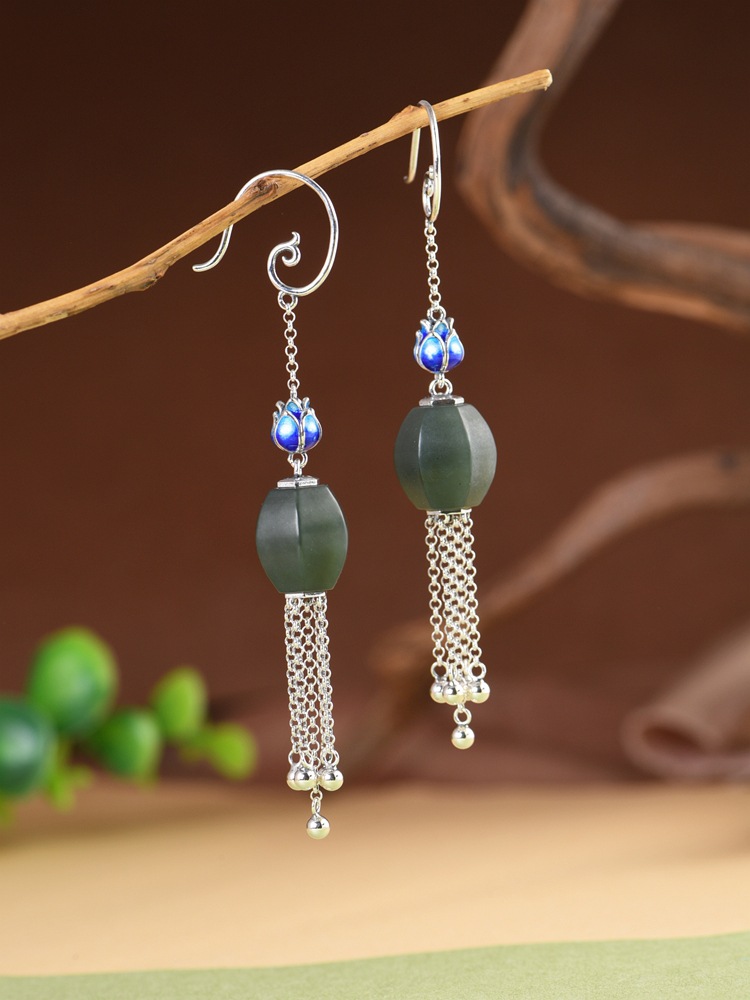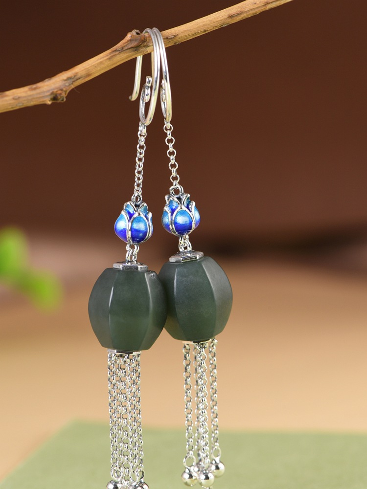 【涟漪清奏】S925银景泰蓝莲花青玉珠长流苏耳坠【SCH-TRS31852】