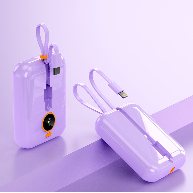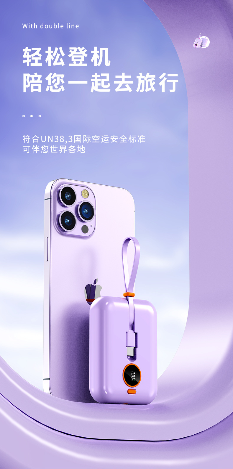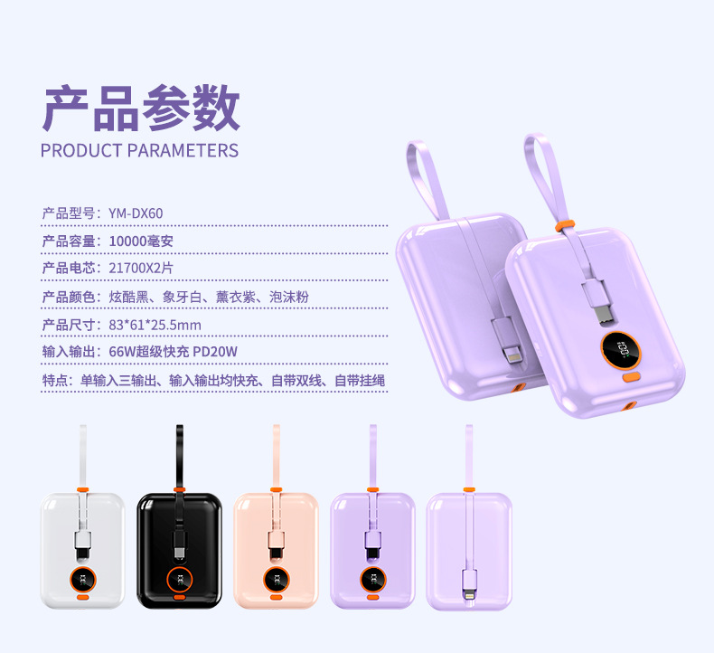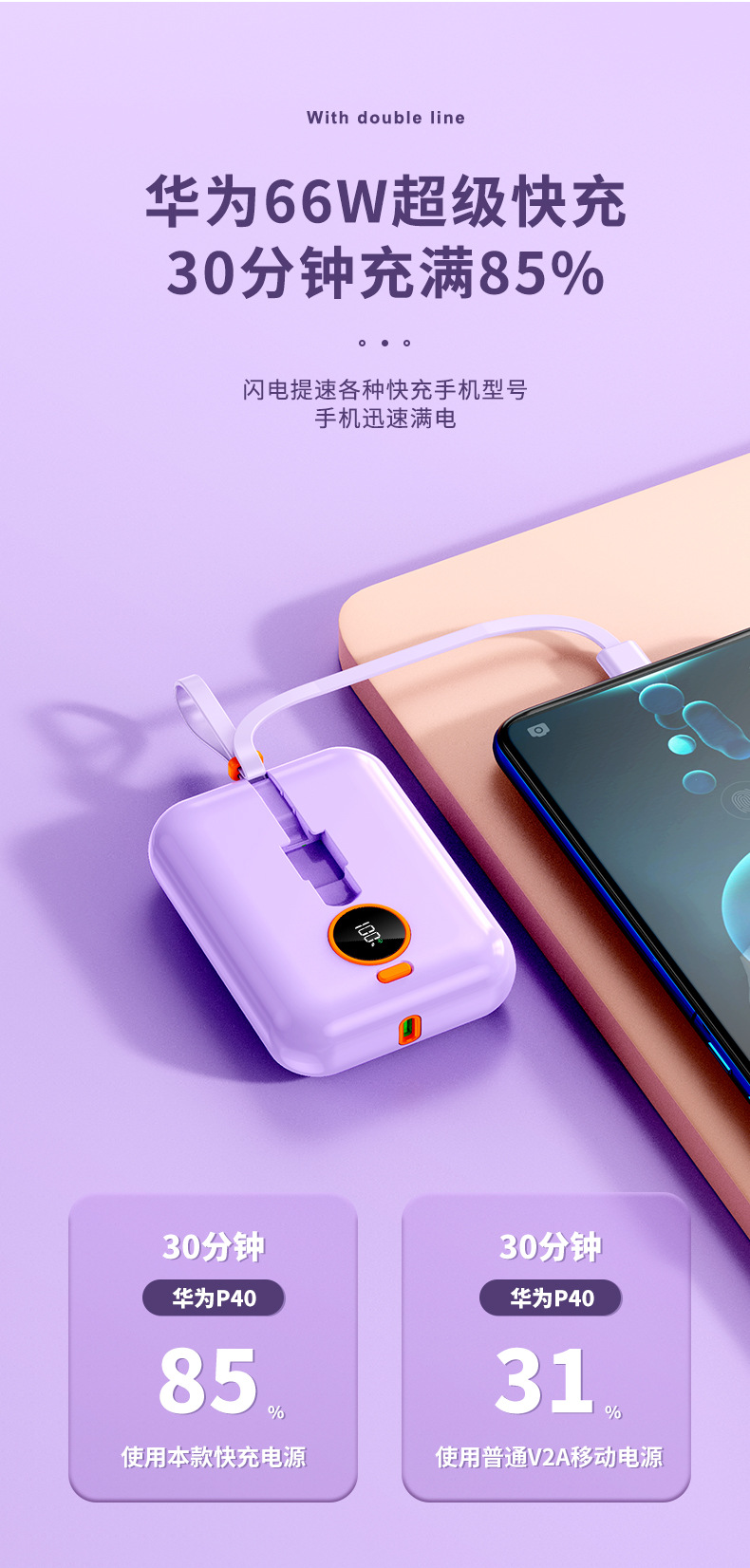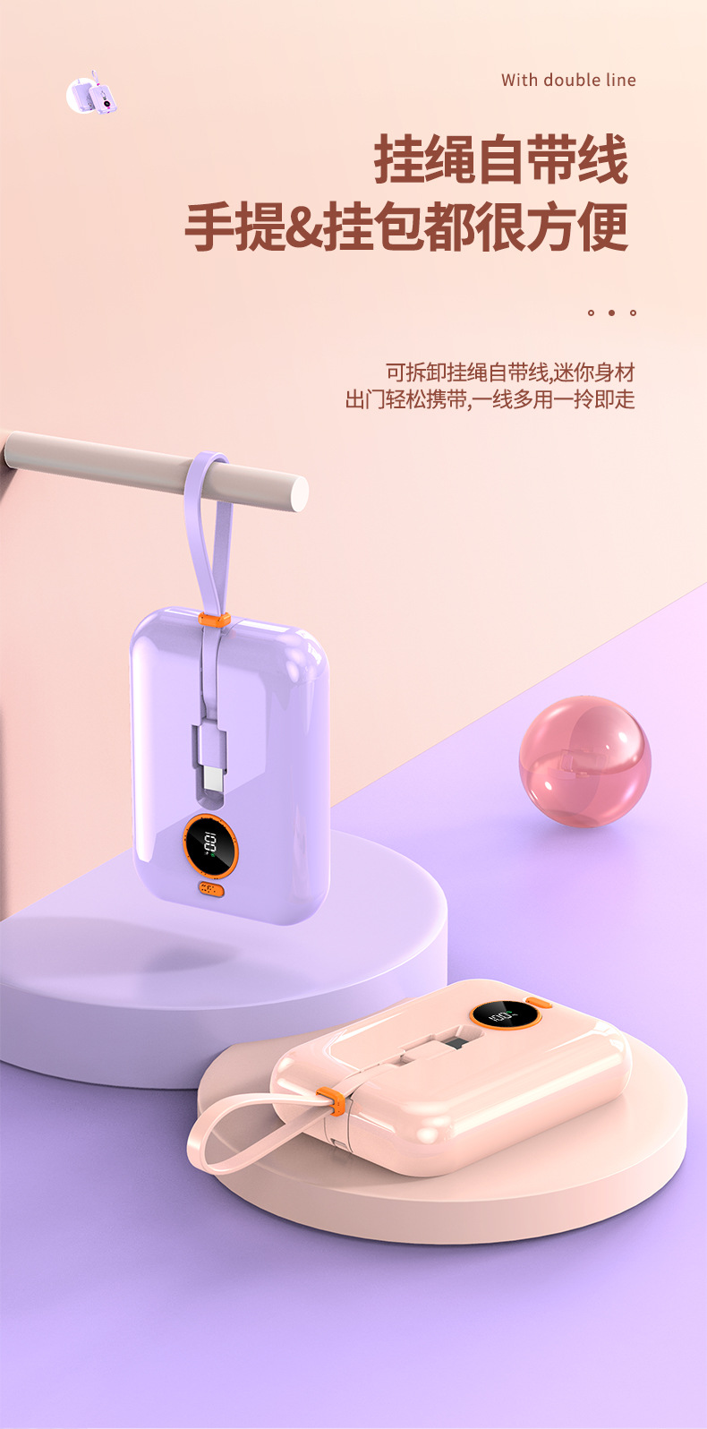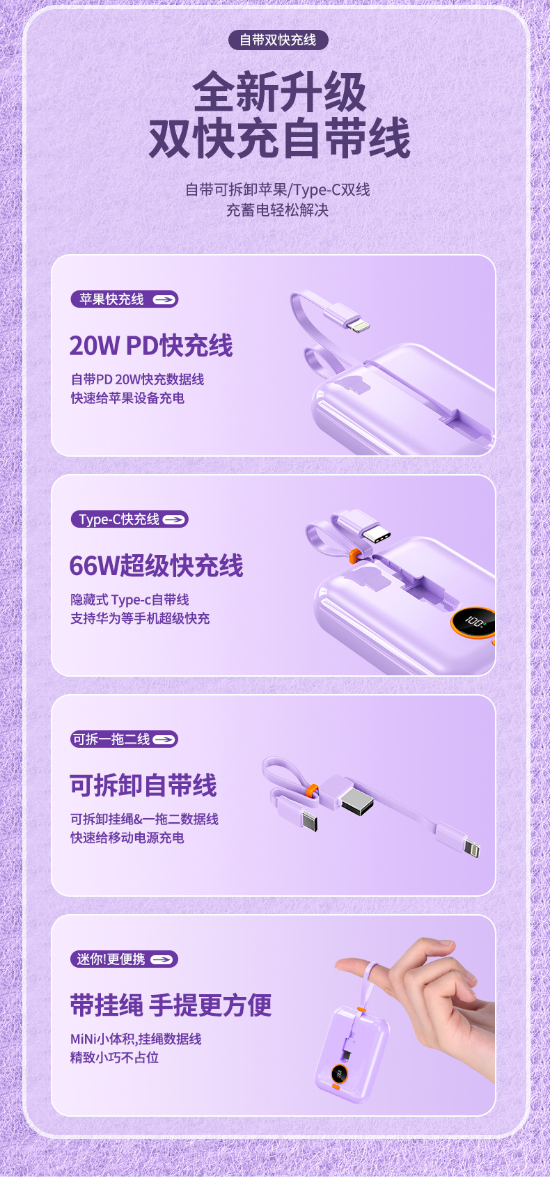 【全新升级!双快充自带线充电宝】可拆卸挂绳自带线,出门轻松携带,PD66W超级快充迷你自带线充电宝20000mAh移动电源礼品。rc