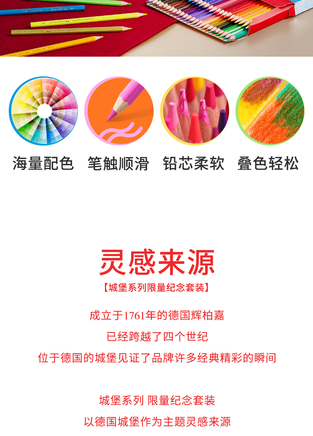 - 德国辉柏嘉,始创于1761年的家族品牌,历经259年岁月洗礼的制笔权威,一直致力于提供高品质书写及绘画艺术创作工具的专业制造商。