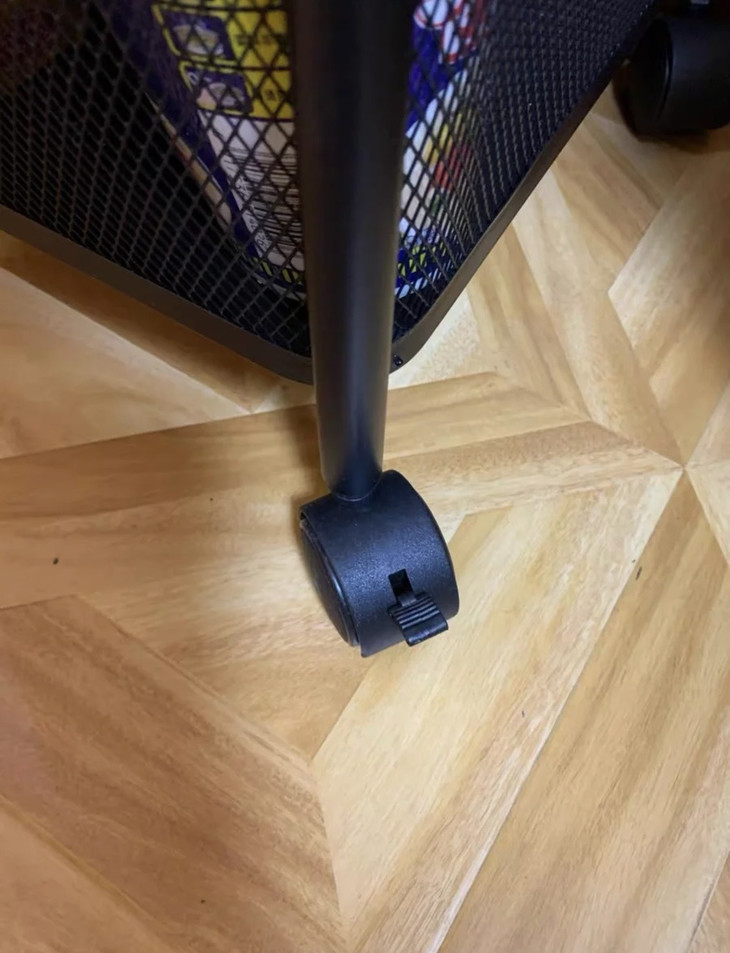 收纳架底部安装了万向轮 移动灵活,停放稳固,不伤地板 想推到哪就推到哪,挪移轻松不费力😟 还带有刹车扣,刹车稳固不摇晃 这个收纳篮也太招人喜欢了( ω )