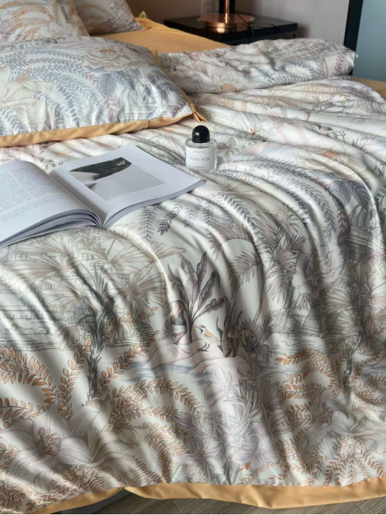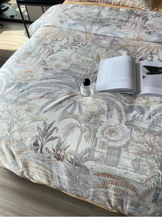 高精密天丝数码印花四件套 面料:80%莱赛尔20%再生纤维素纤维 工艺:高精密数码印花+断角 规格:被套200x230cm床单245x250cm枕套48x74cmx2