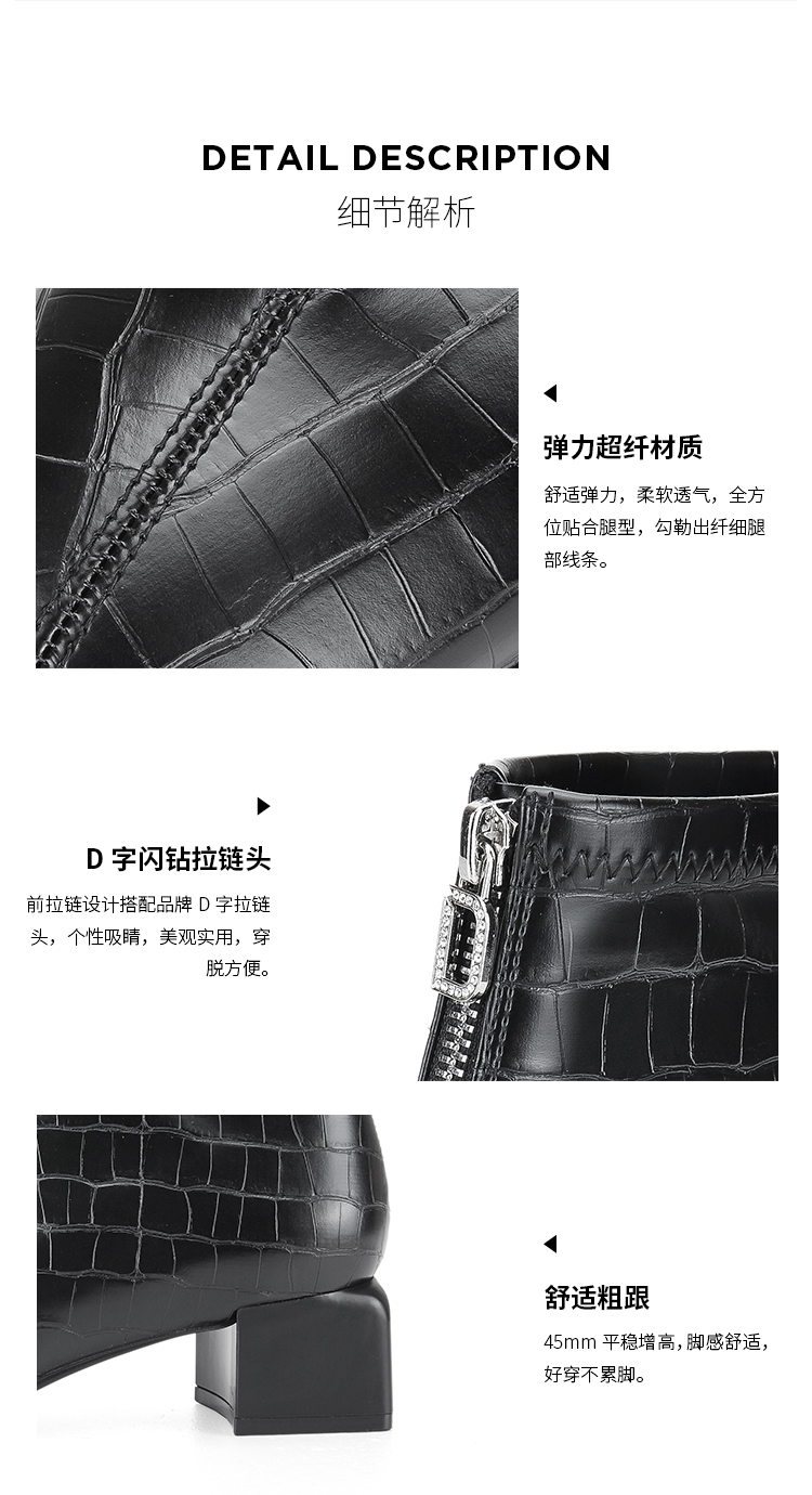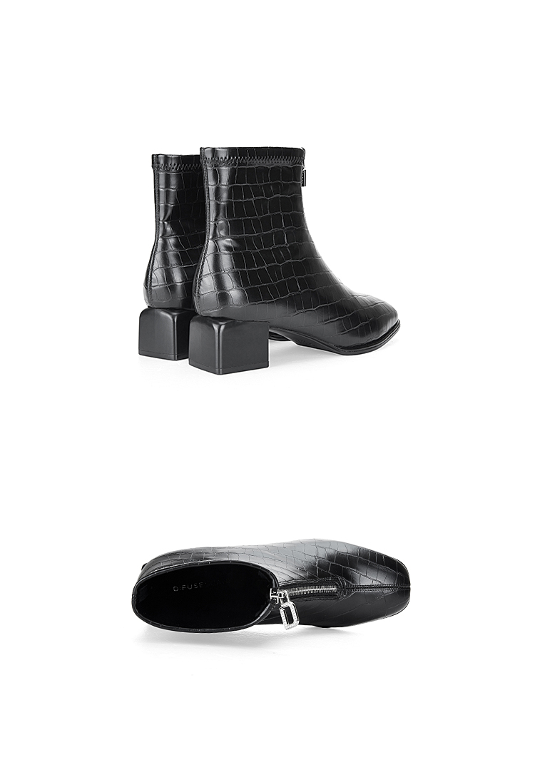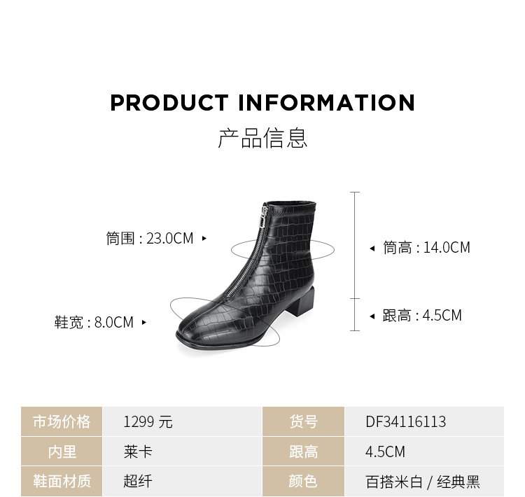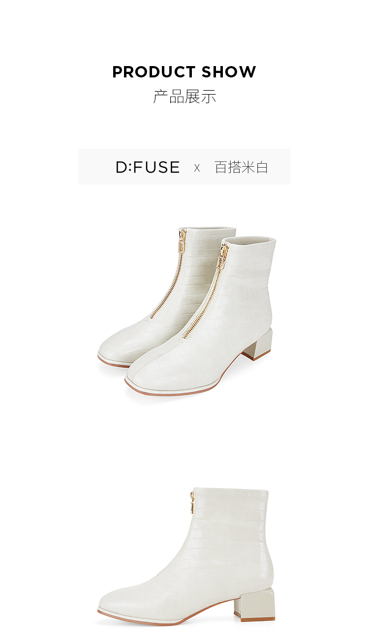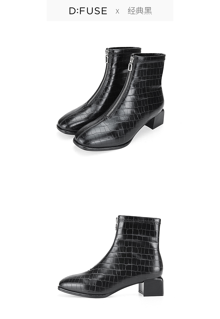 Dfuse迪芙斯冬新款时尚方头压纹前拉链粗跟瘦瘦靴短靴DF34116113