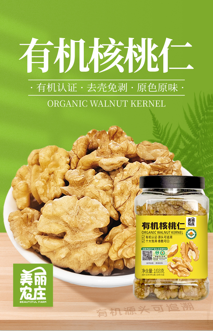 美丽农庄 瓶装有机核桃仁168g