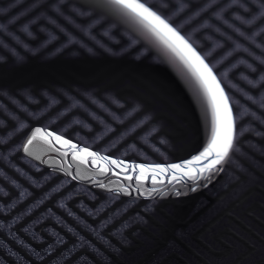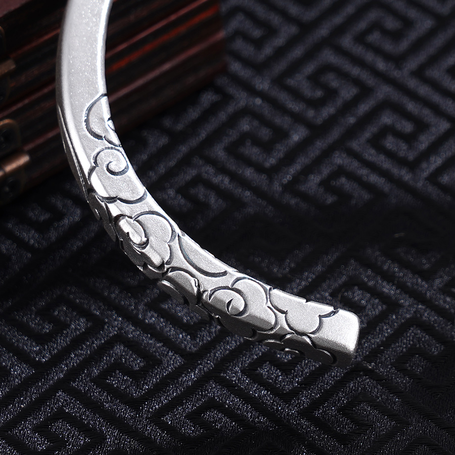 【寓意】:瑞气随腕而生,福禄寿增于其中。设计师以祥云为设计理念,应用仿古、錾刻工艺打造了此款手镯。祥云多多,幸福连绵,整体色泽低调且富有质感。