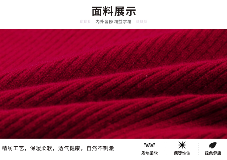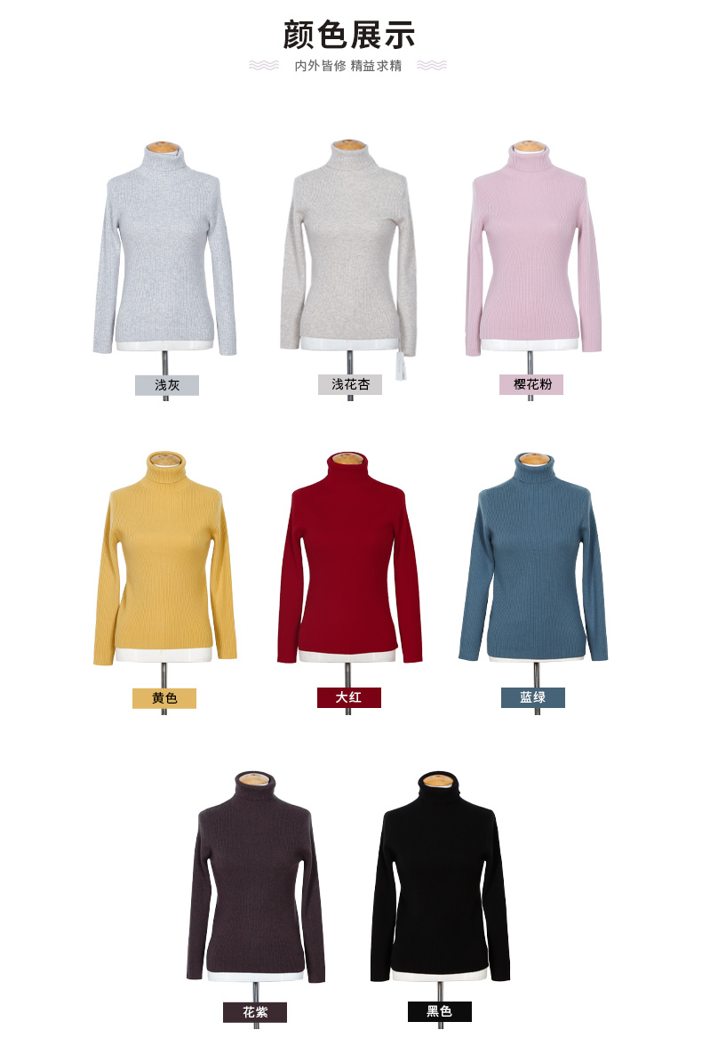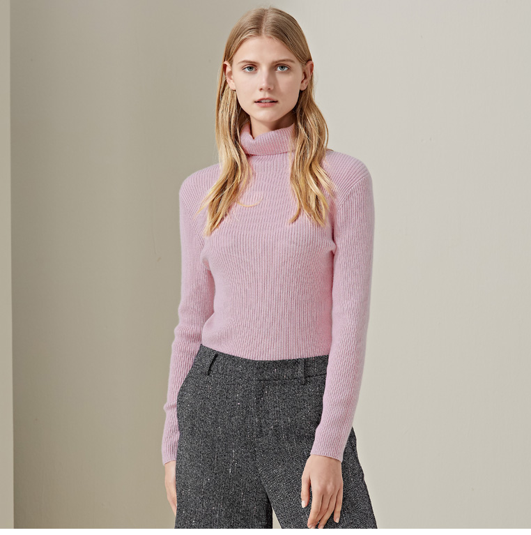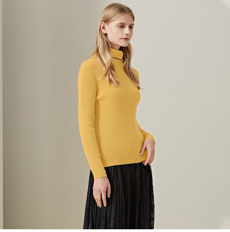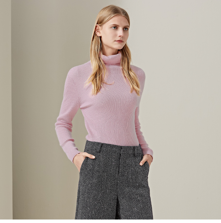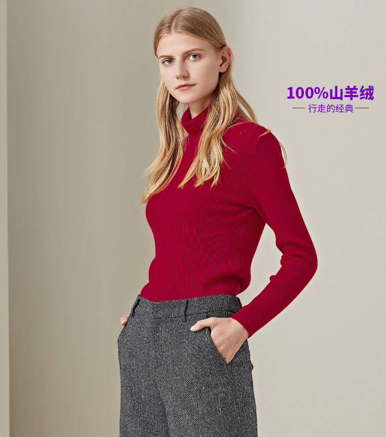 羊绒世家2020年早春新品女士高领100%山羊绒衫时尚抽条修身毛衣