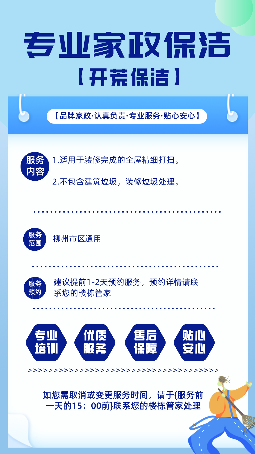 服务说明:临近春节期间库存较满,请提前安排您的保洁服务,若因库存问题导致无法服务,请您谅解!