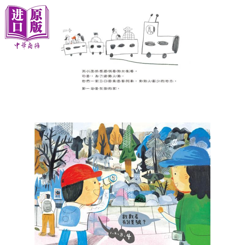 第二天,他戴着喜欢的帽子(猜猜是什么颜色),也带着喜欢的溜溜球(这是串起整个故事的重要物件,翻页阅读之间请寻找它的存在),跟着爸爸妈妈来到动物园。虽然好想赶快看到大象,可是为了避开人潮,他们一家三口搭乘游客列车,从人少的地方开始逛起,di一站正是灰狼的家。
