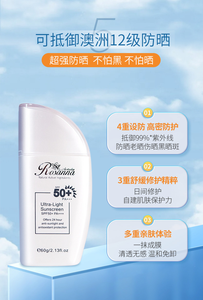 【品名】澳洲 Rosanna诺珊娜 轻透防晒霜 【规格】60g/瓶 【产地】澳洲 【不发货区域】新疆、西藏、港澳台 |