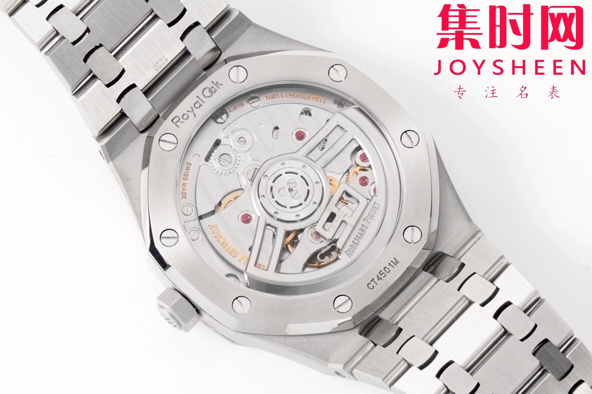 字面依旧是特有的方形纹路,12点钟位置的24K 金立体「Audemars Piguet」标志采用电镀生成法(类似3D 列印)制作而成,取代过去的立体「AP」标志及印刷爱彼字样。