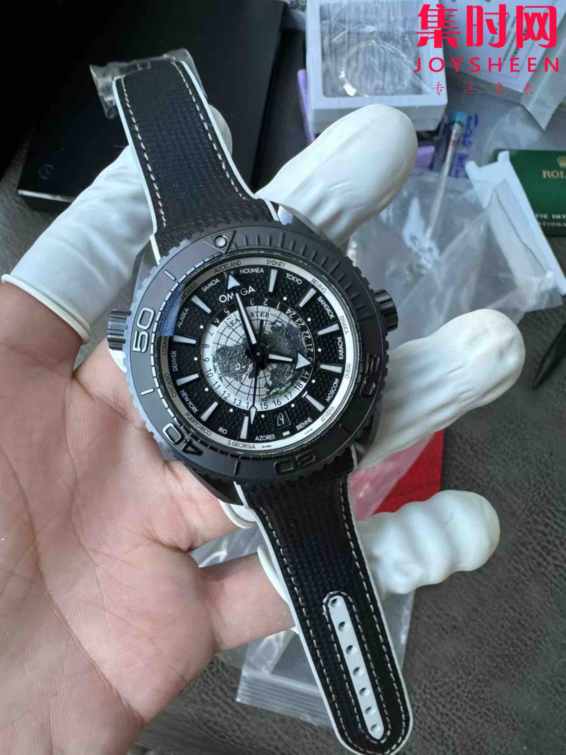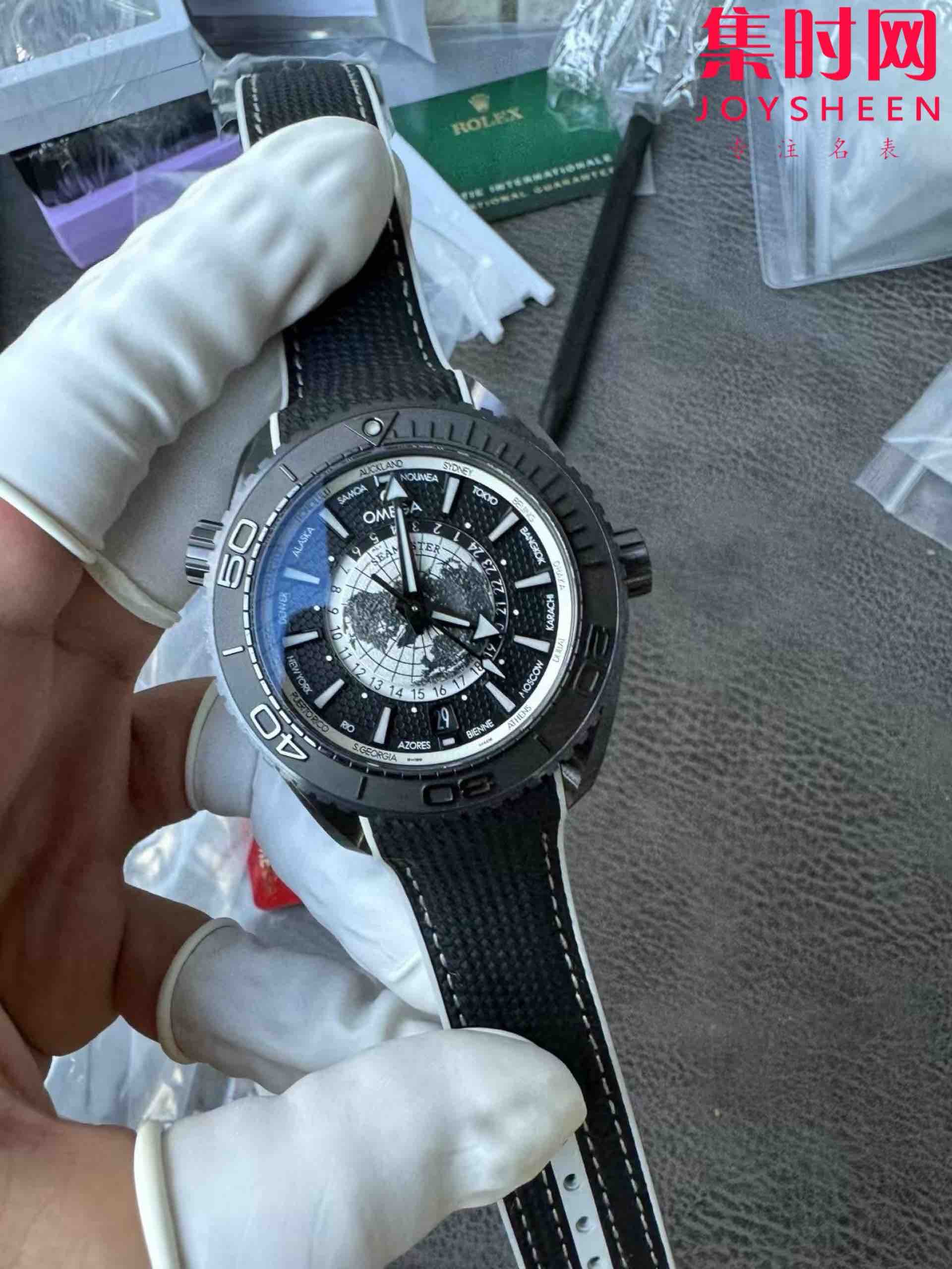 欧米茄 VS海马600米系列 海洋宇宙 海马世界时陶瓷壳 碳黑水泥灰 男士腕表 表径45.5mm 8938一体机 快跳日历 双色夜光