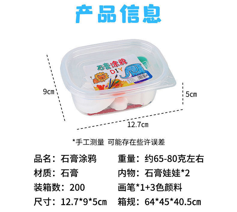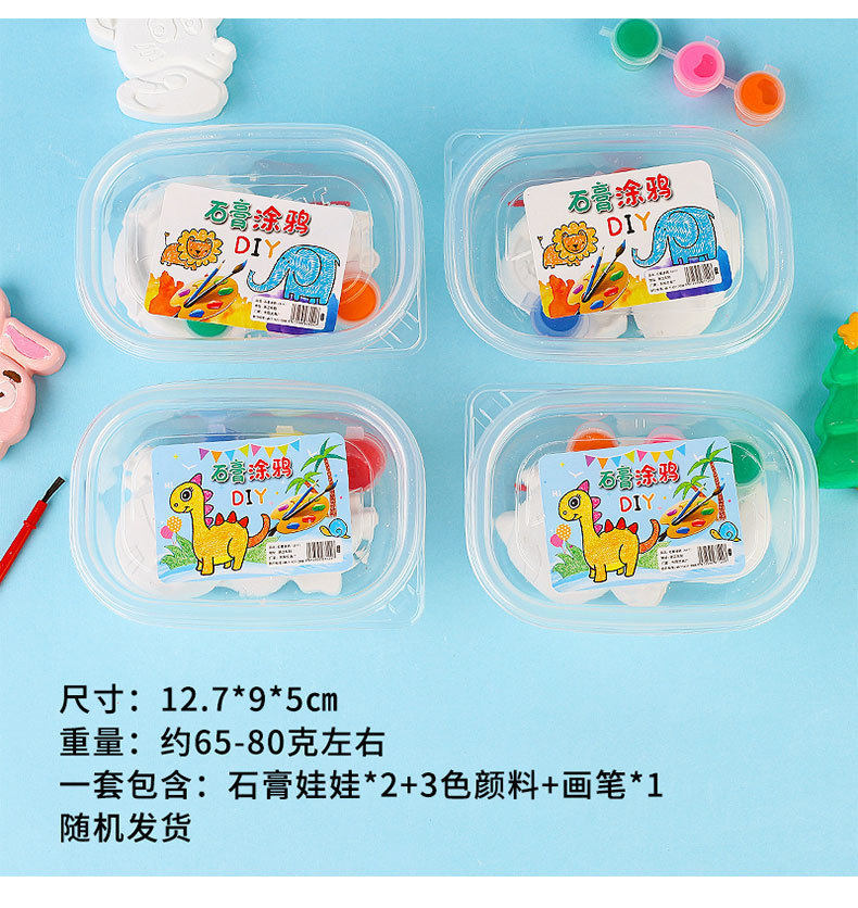 包装:盒装 一盒里面包含: 石膏娃娃2个+ 3色颜料+ 画笔 1个