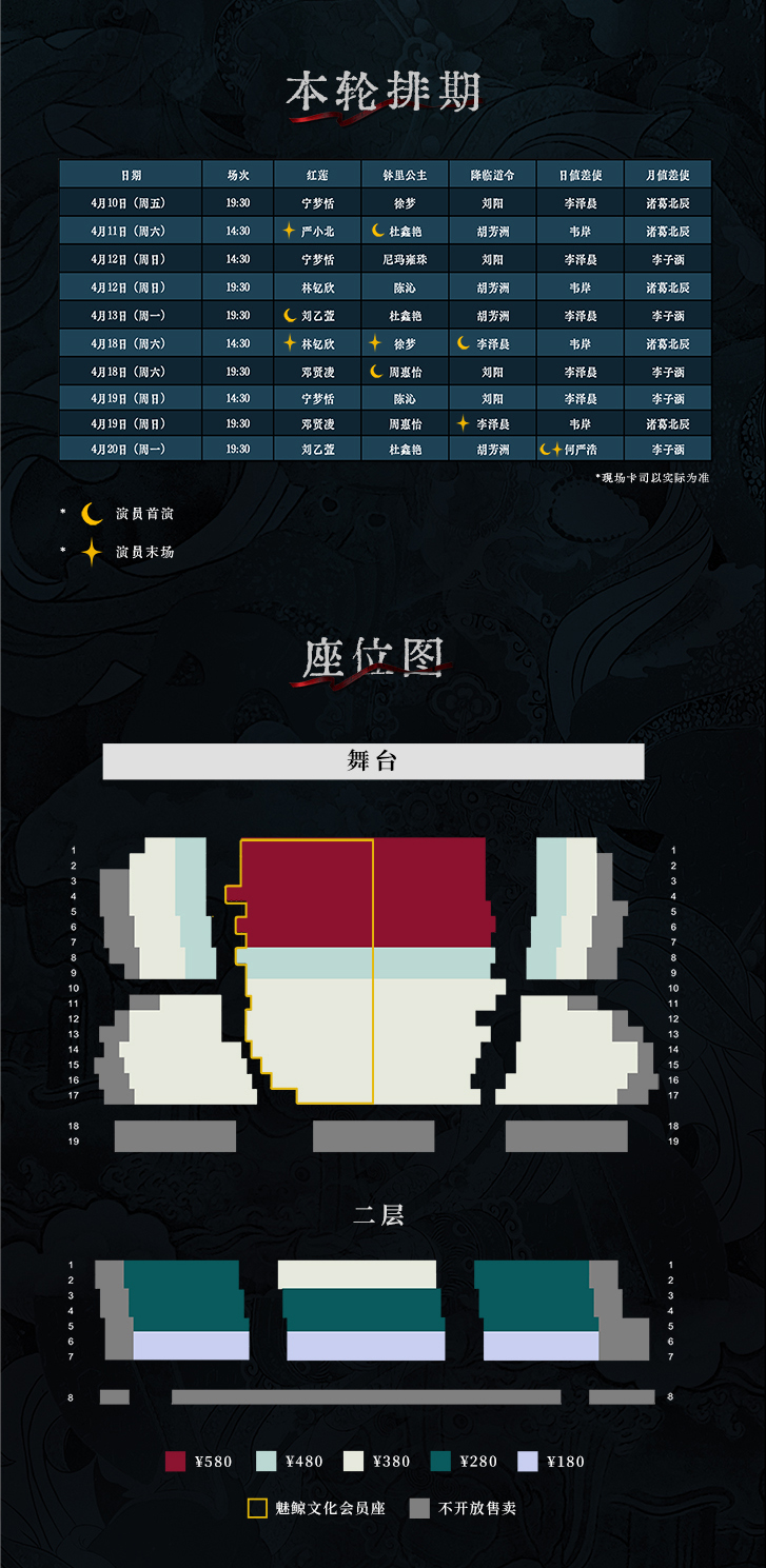 开票日次日起(例如19日12:00开票,20日0:00起即算次日)下的订单,原则上优先按照上面的出票顺序出票,在不影响连座的情况下可按照留言备注希望的座位出票(如有)。