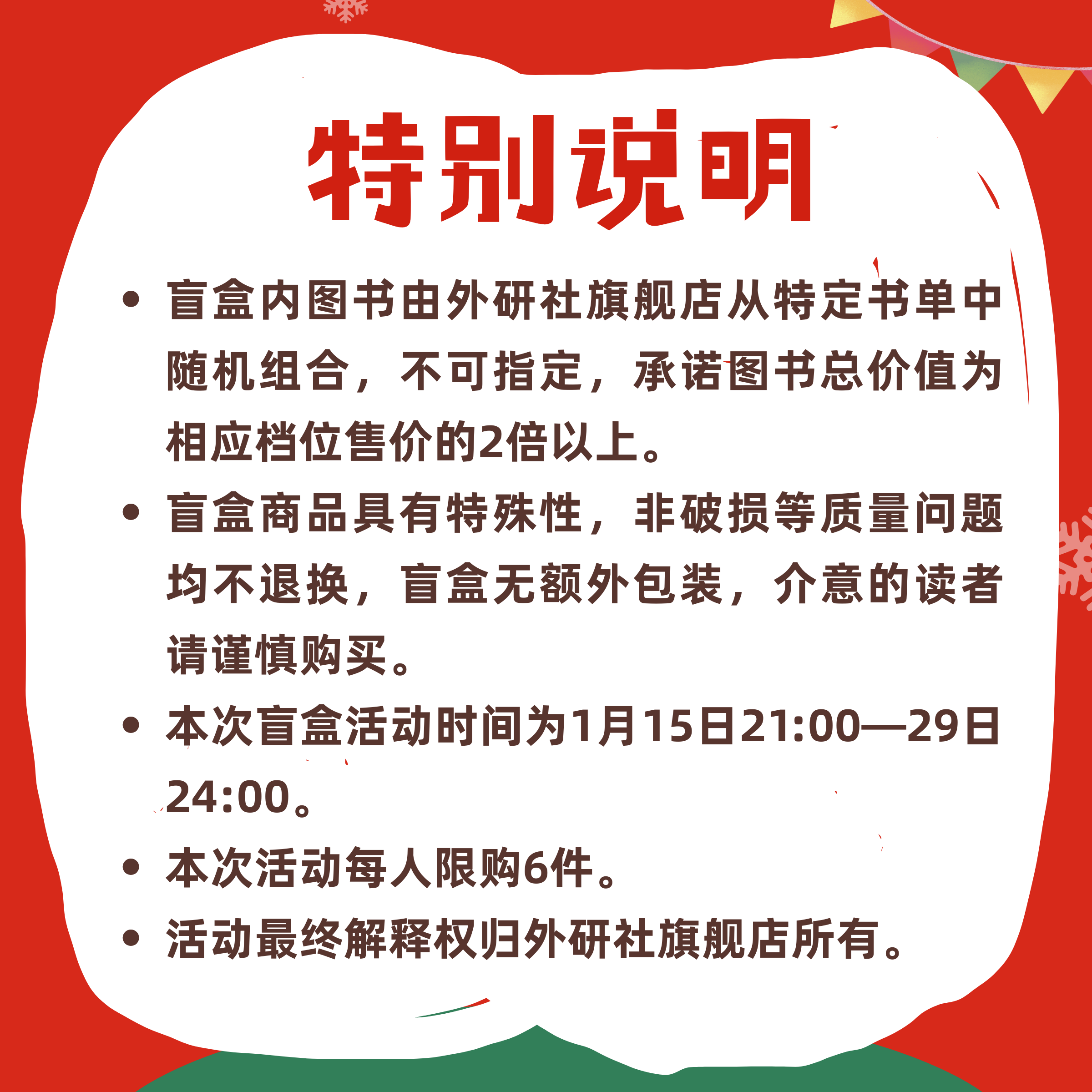 1. 盲盒内图书由外研社旗舰店从特定书单(见下方)中随机组合,不可指定,承诺图书总价值为相应档位售价的2倍以上。