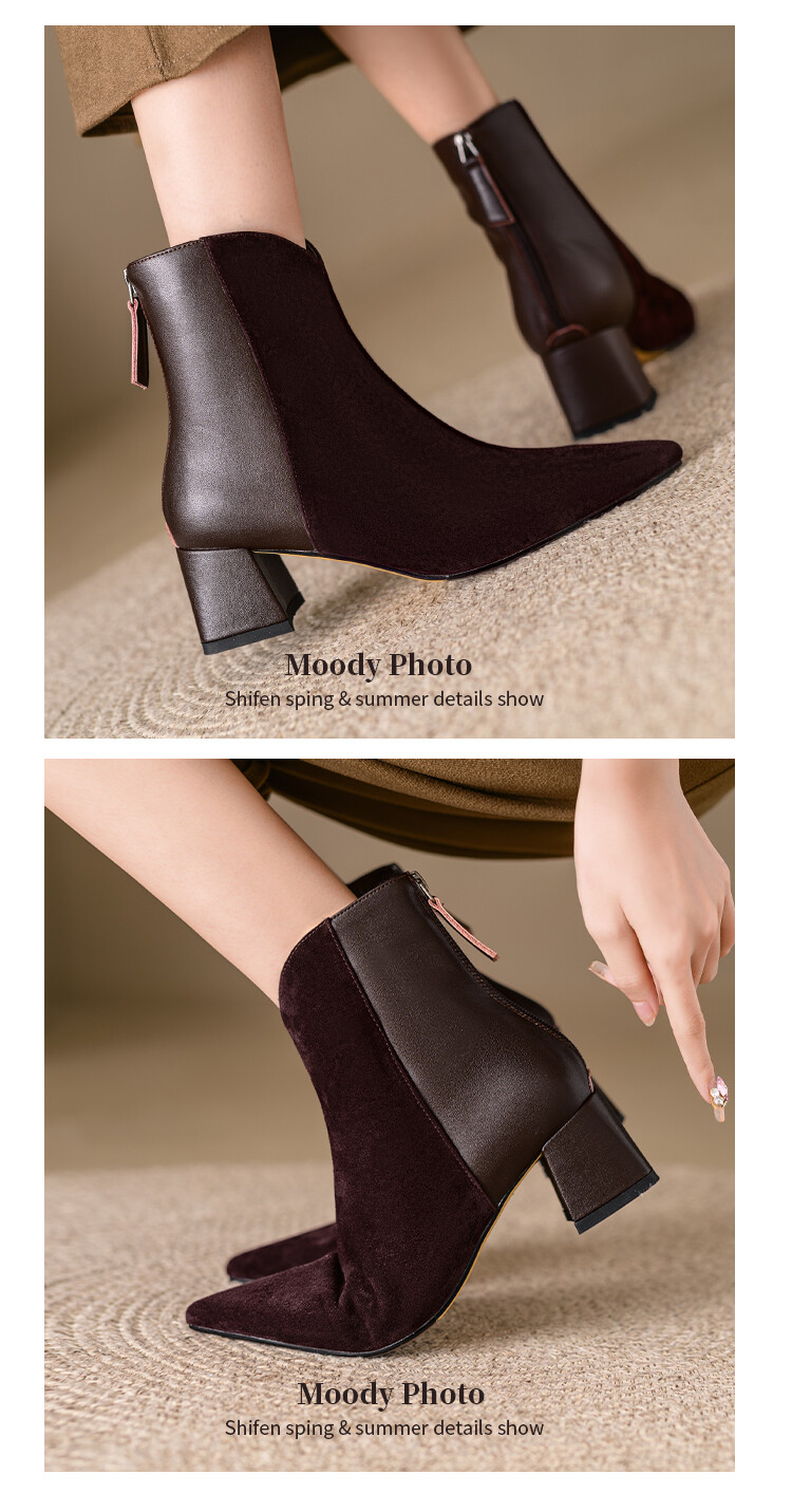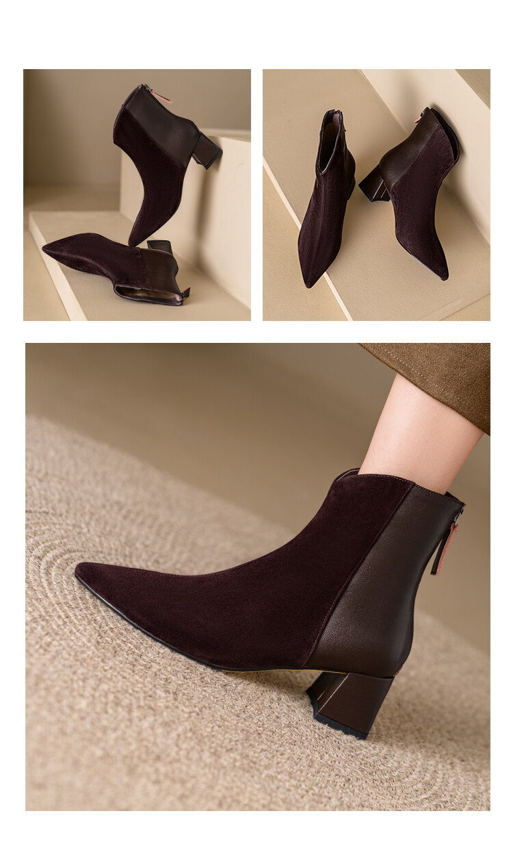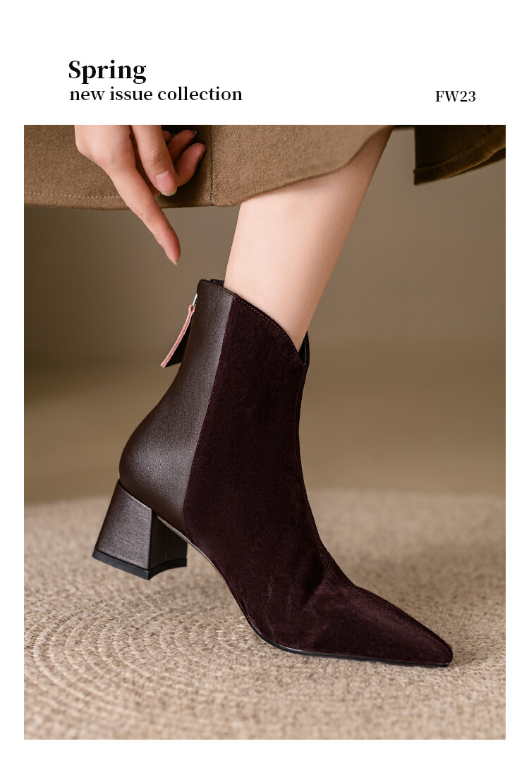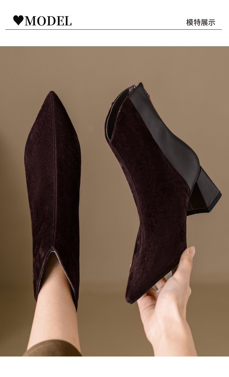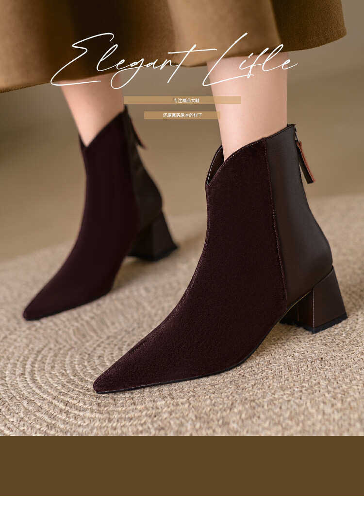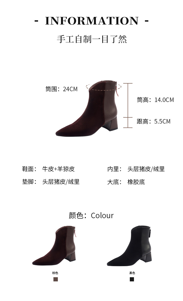 【预售5天】V口短靴女秋冬新款简约拼接棕色粗跟马丁靴羊翻皮中跟后拉链单靴XMNEHD&H260