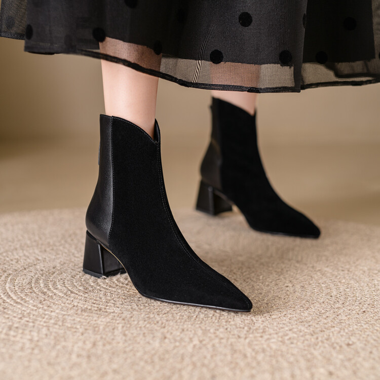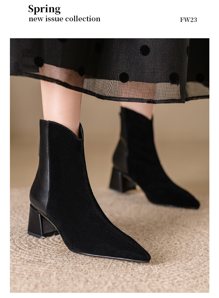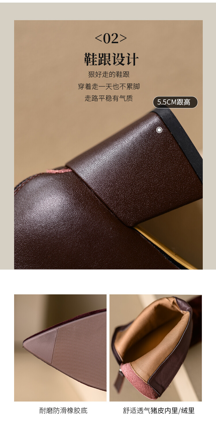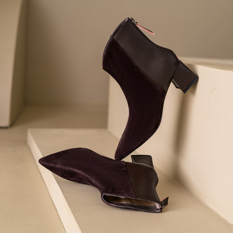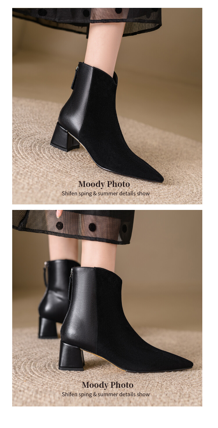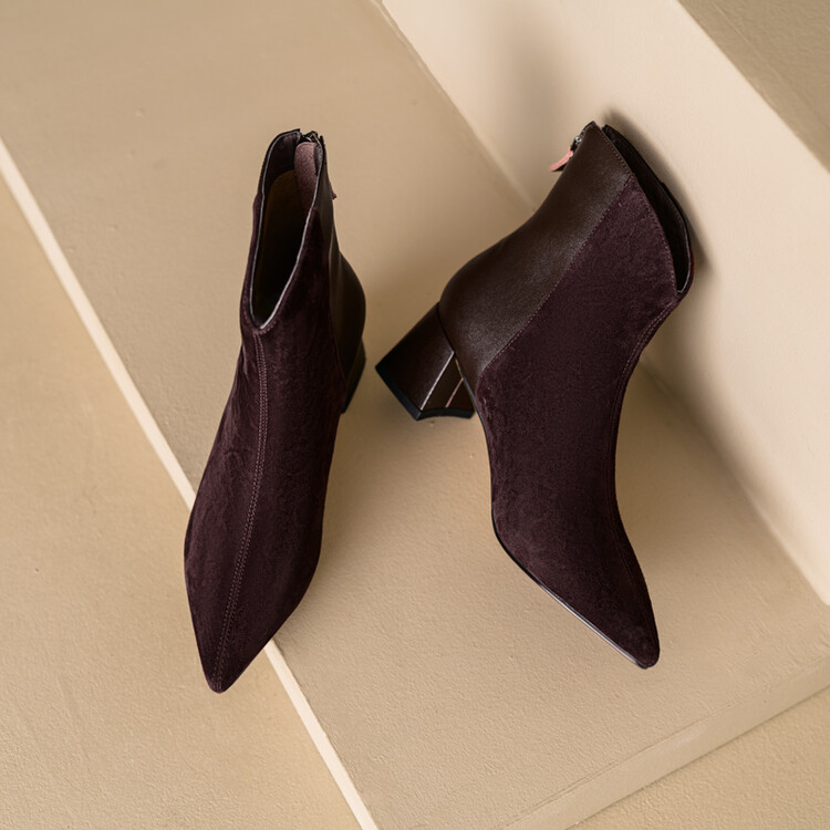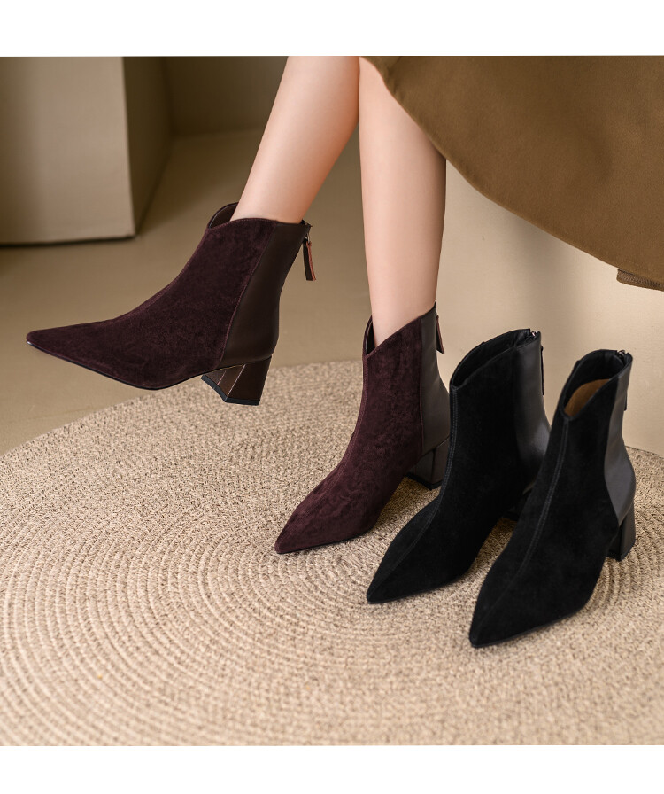 【预售5天】V口短靴女秋冬新款简约拼接棕色粗跟马丁靴羊翻皮中跟后拉链单靴XMNEHD&H260