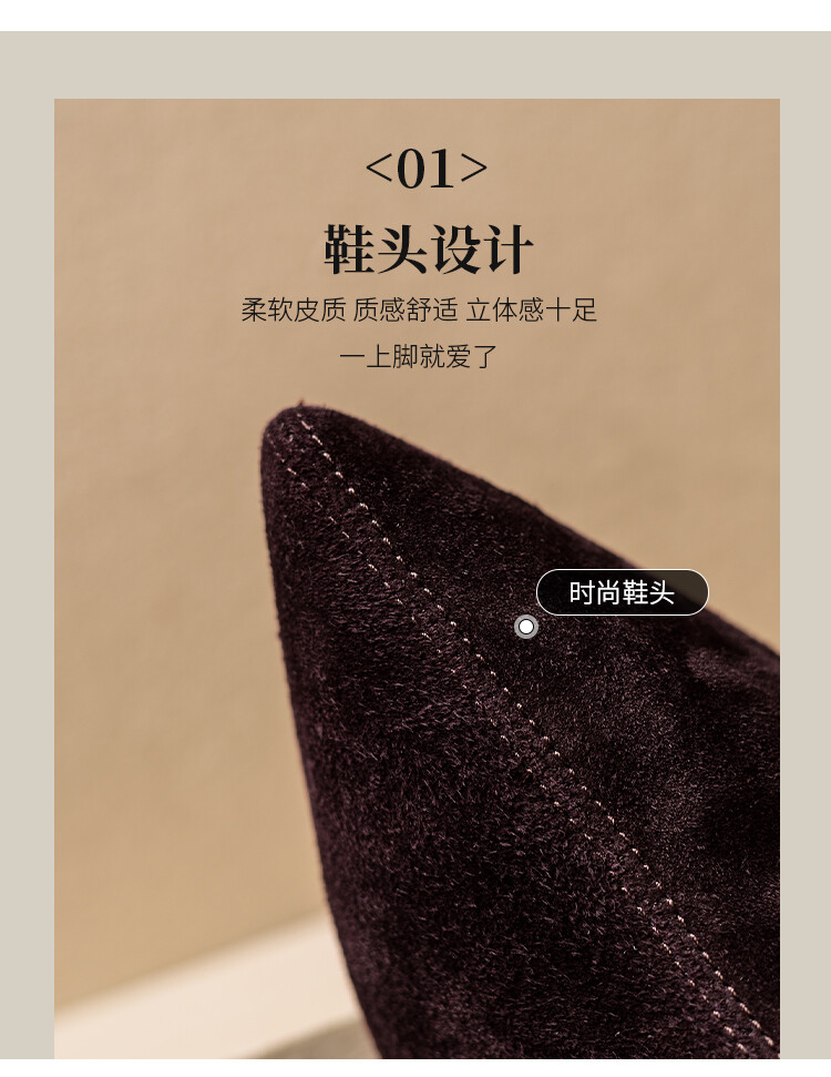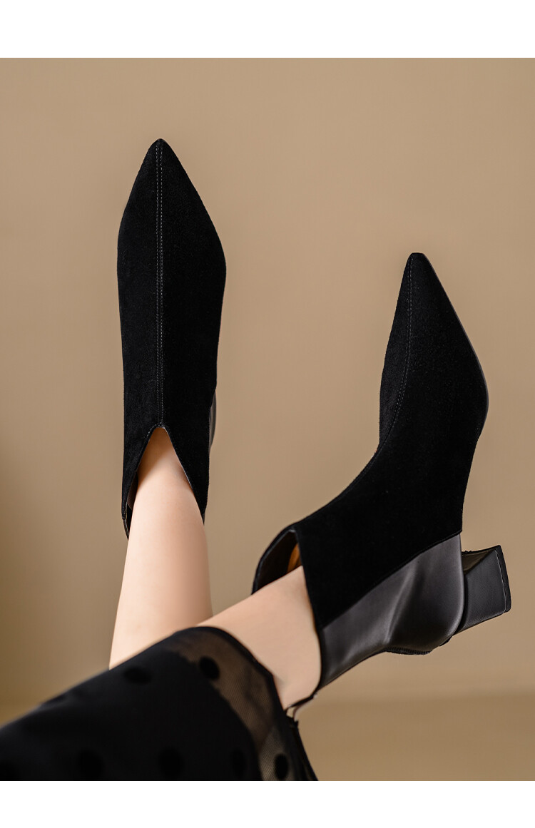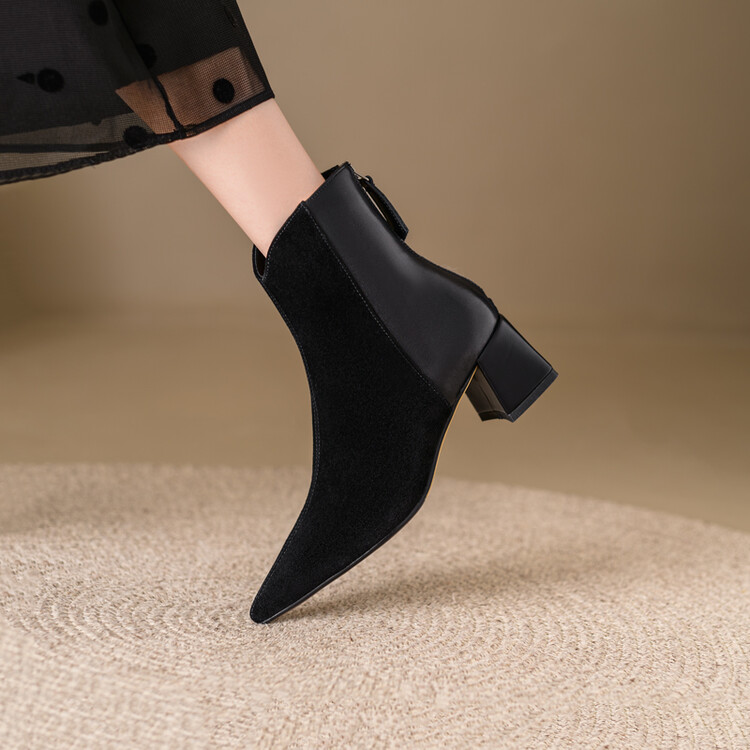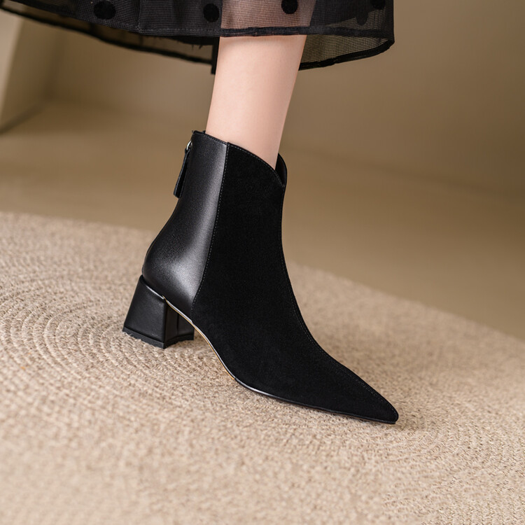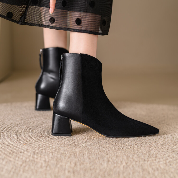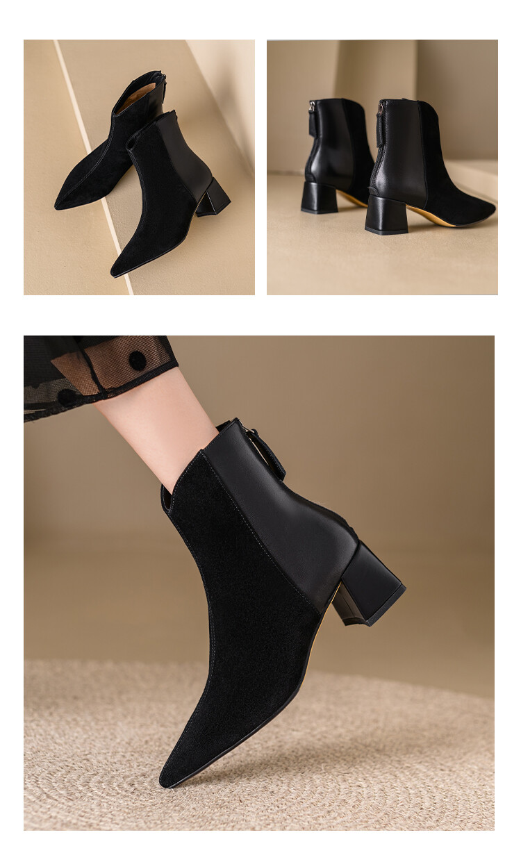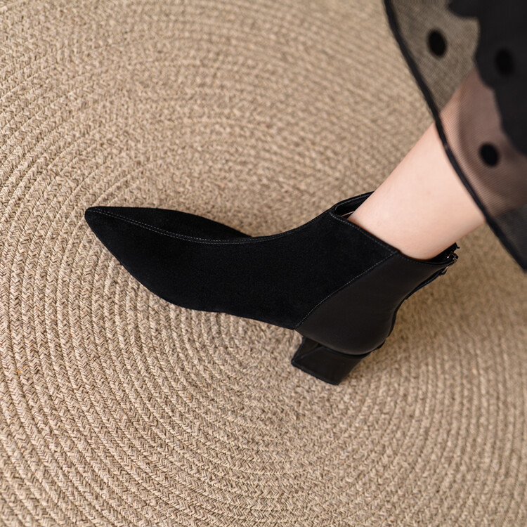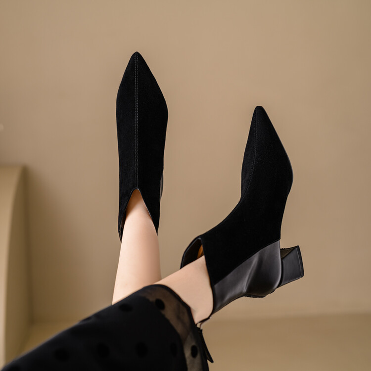 【预售5天】V口短靴女秋冬新款简约拼接棕色粗跟马丁靴羊翻皮中跟后拉链单靴XMNEHD&H260