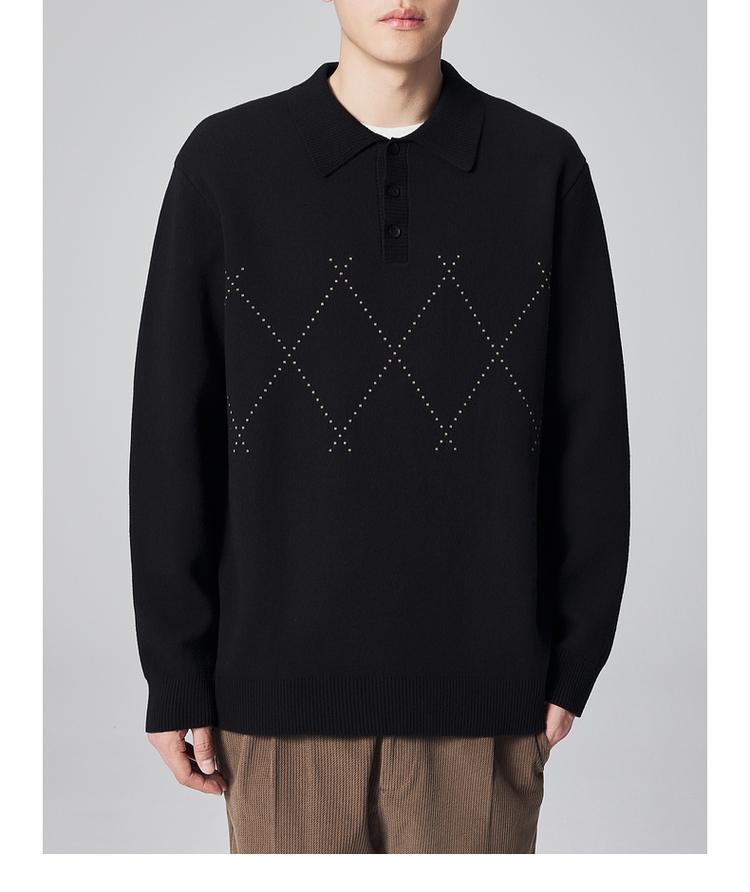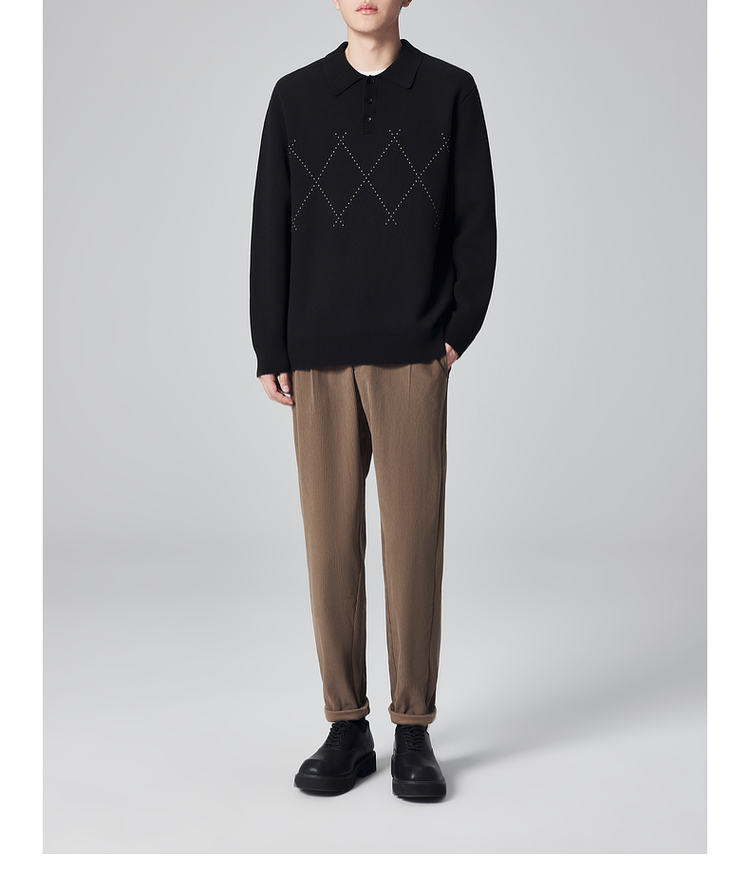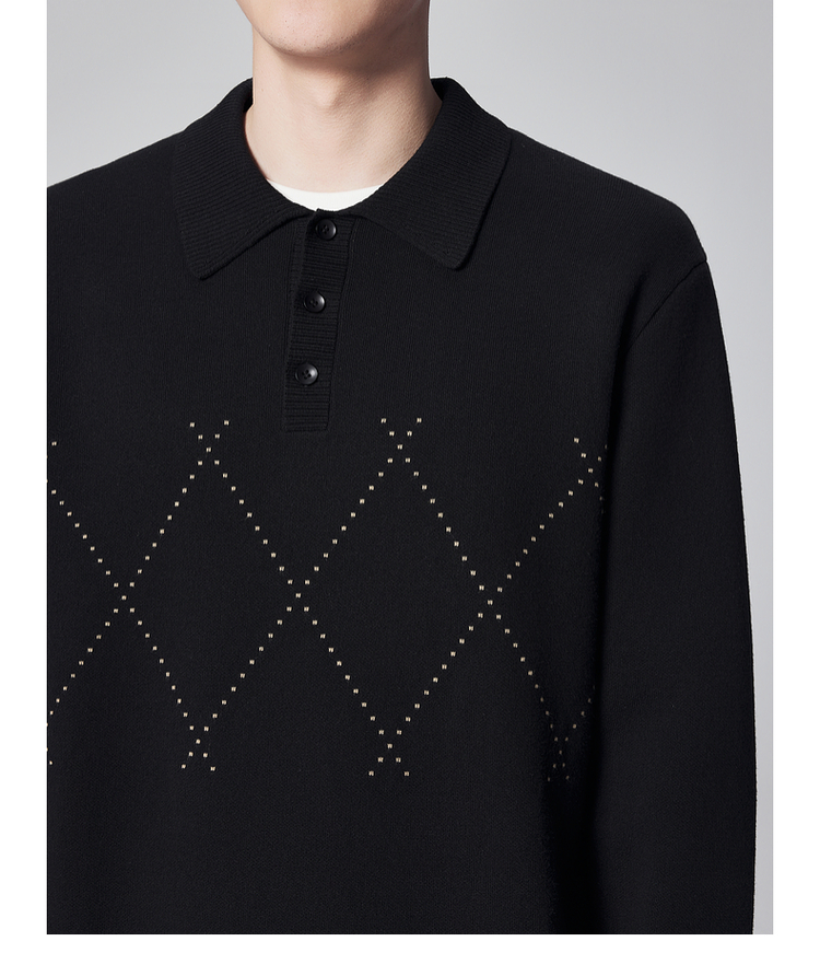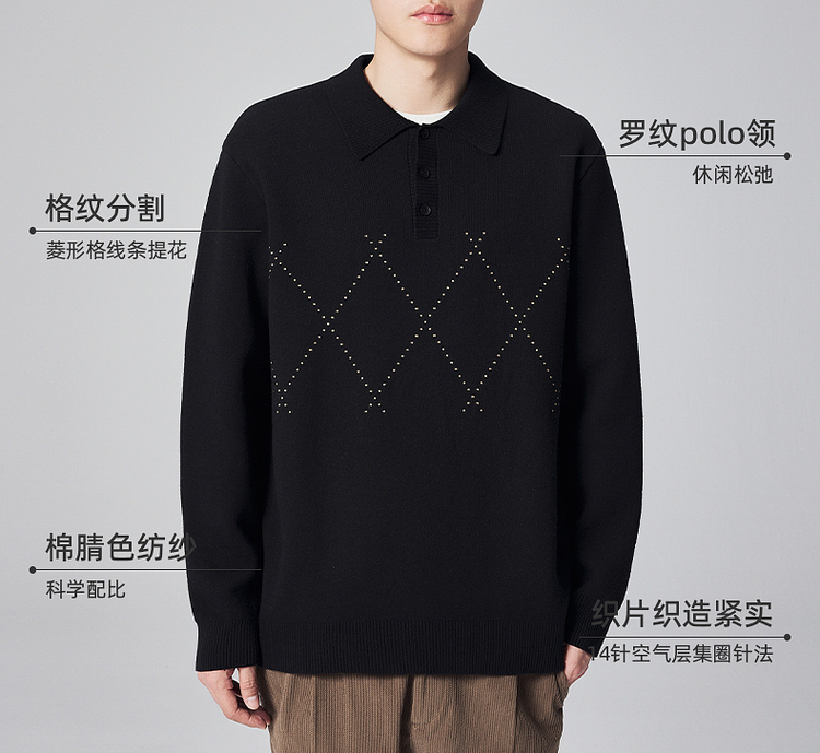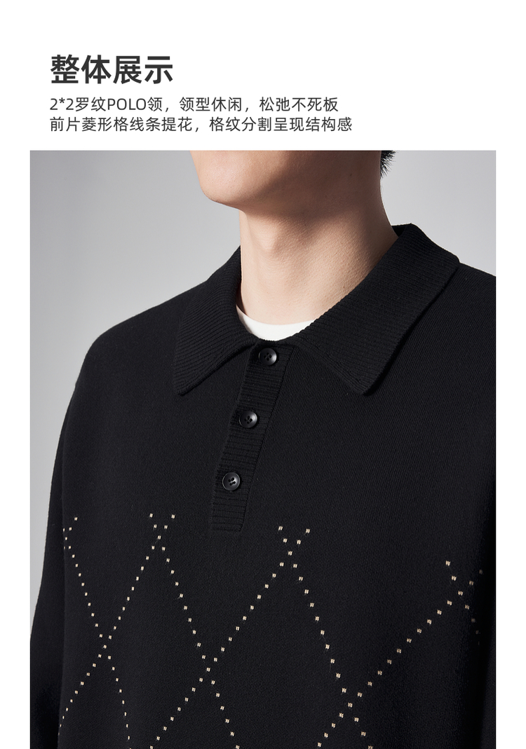 墨麦客男装菱形格提花男士翻领针织衫2024秋季新款撞色休闲毛衣男