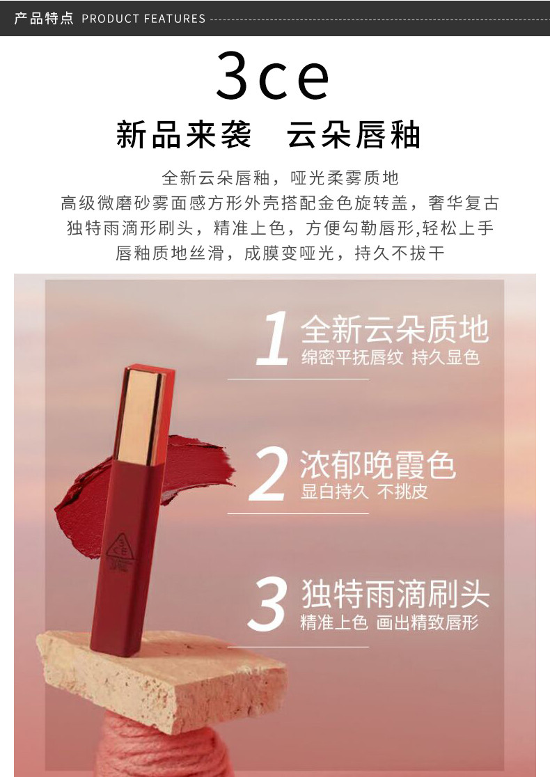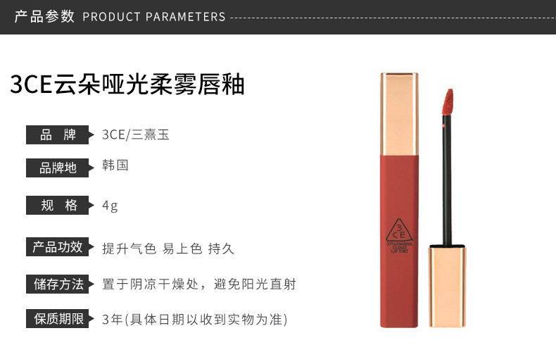 3CE 丰润柔雾云朵唇釉胡萝卜色 #PEACH TEASE 4G