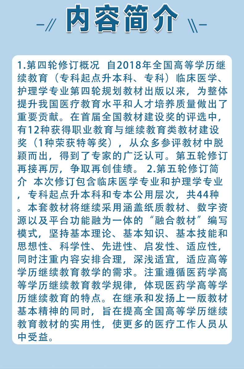 1.第四轮修订概况 自2018年全国高等学历继续教育(专科起点升本科、专科)临床医学、护理学专业第四轮规划教材出版以来,为整体提升我国医疗教育水平和人才培养质量做出了重要贡献。在首届全国教材建设奖的评选中,有12种获得职业教育与继续教育类教材建设奖(1种荣获特等奖),从众多参评教材中脱颖而出,得到了专家的广泛认可。第五轮修订再接再厉,争取再创佳绩。 2.第五轮修订简介 本次修订包含临床医学专业和护理学专业,专科起点升本科和专本公用层次,共44种。本套教材将继续采用涵盖纸质教材、数字资源以及平台功能融为一体的“融合教材”编写模式,坚持基本理论、基本知识、基本技能和思想性、科学性、先进性、启发性、适应性,同时注重内容安排合理,深浅适宜,适应高等学历继续教育教学的需求。注重遵循医药学高等学历继续教育教学规律,体现医药学高等学历继续教育的特点。在继承和发扬上一版教材基本精神的同时,旨在提高全国高等学历继续教育教材的实用性,使更多的医疗工作人员从中受益。