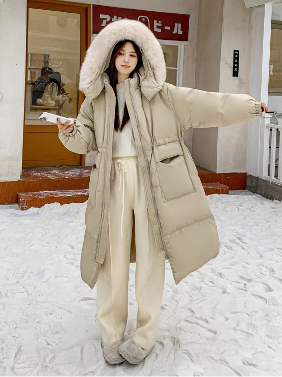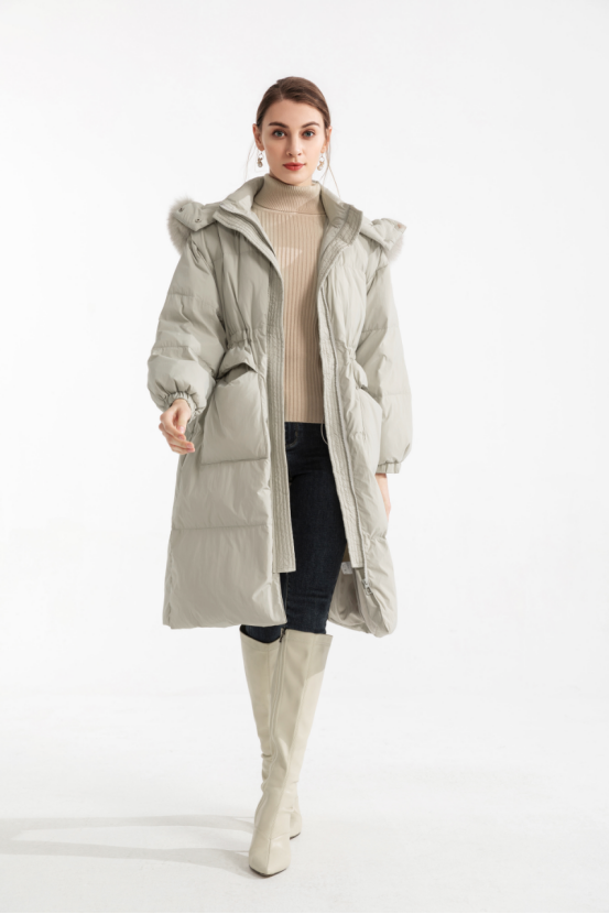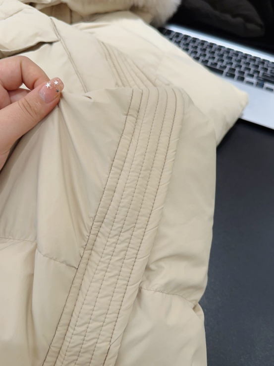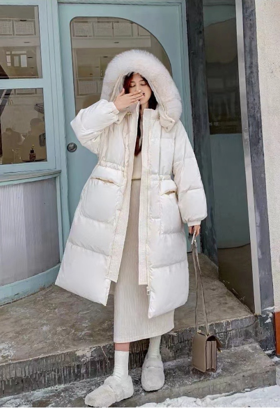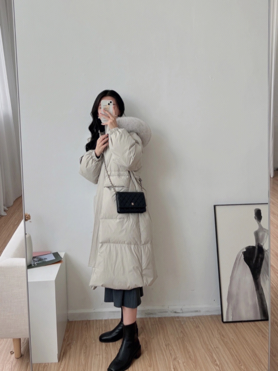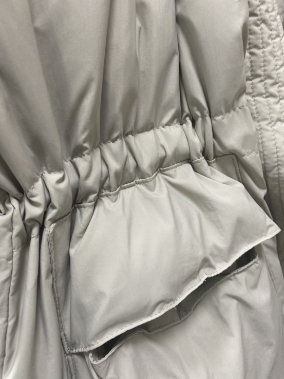 🤍米灰色 出口法、韩国高定款,版型讲究 (小部分水洗唛为韩文,随机发) 连帽长款可收腰设计,少女感十足 有羽绒服的充盈感&保暖度 有一定的阔感,但拒绝臃肿