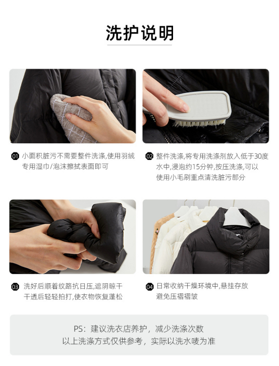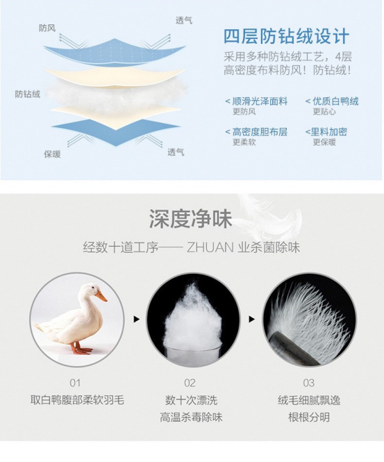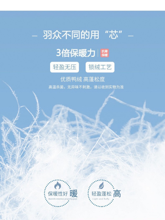 严格选用优质白鸭绒充绒, 一件羽绒服保暖不保暖 关键就是要看里面填充的绒 坚持采用一些贵价羽绒品牌才舍得用到的白鸭绒 这种羽绒是非常蓬松 ✅充绒量约265g,细而密,还很轻: ✅蓬松饱满,更加保暖,挺阔有型,却不臃肿 ✅四层防钻绒锁绒工艺,线条流畅,松紧一致,不易钻绒