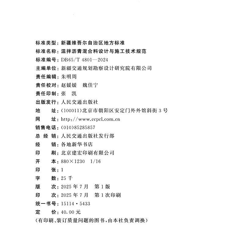 书名:温拌沥青混合料设计与施工技术规范(DB65/T 4801—2024)