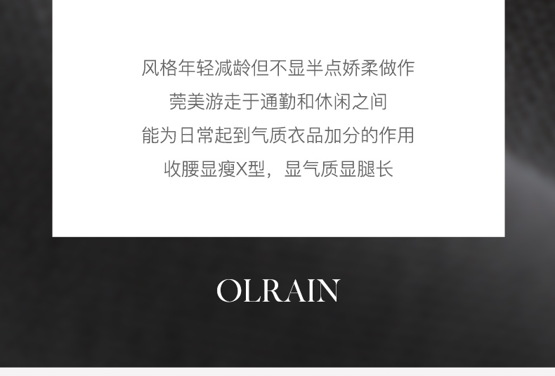 - “精致”是欧芮儿olrain品牌文化的核心,欧芮儿认为,精致的女人,不但要外在动人,更要内在迷人,内外兼修,有魅力、有气质、有内涵,自信而不自傲,优雅而不矫揉,自有万种风情而不轻浮,更不故作矜持。