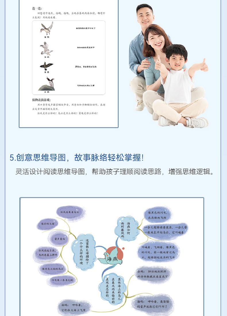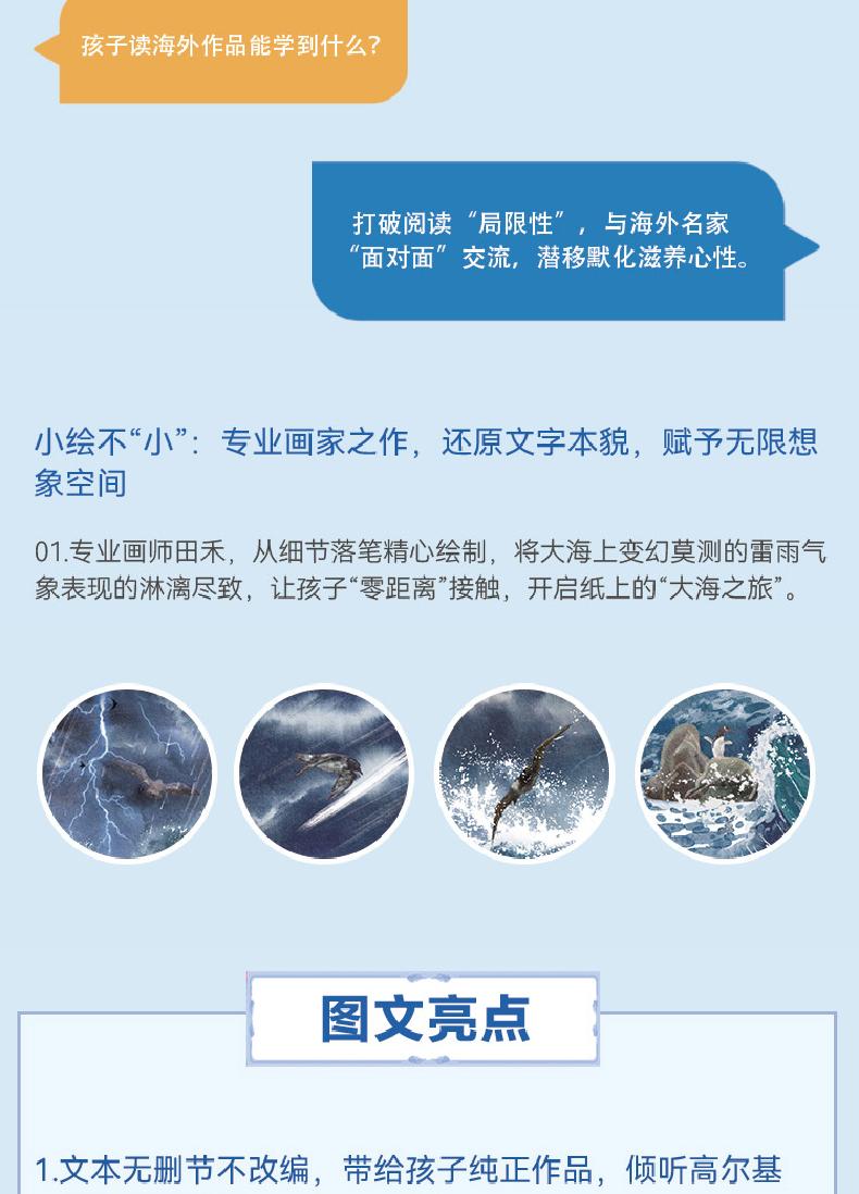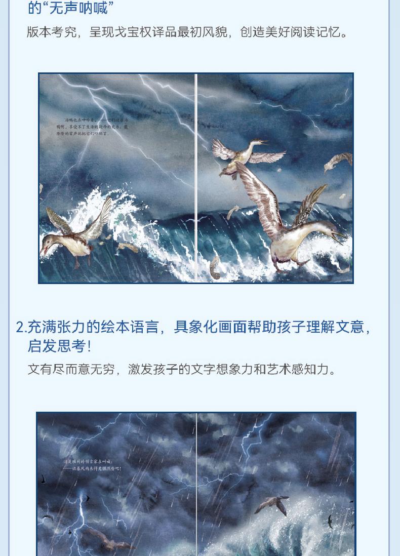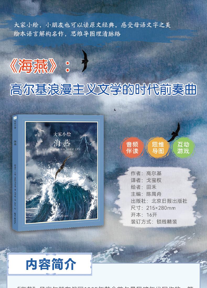 《海燕》是文学巨匠高尔基的一首经典散文诗。根据儿童阅读需求贴心设计,以逼真、具象化的图画为读者展现大海上暴风雨即将来临时狂风怒吼、雷声轰响、巨浪翻腾等变幻莫测的自然景象,与绘声绘色的音频完美融合,带来一场纸上沉浸式的视觉、听觉盛宴。诗中文字无删节不改编,简单的文字里讲述了暴风雨中海鸥的胆怯、海鸭的害怕、企鹅的无助、海鸥的勇敢,诠释着生活中我们遇到困难时从不知所措到勇敢面对的历程,在漫长的人生旅途中给予我们更多的力量和勇气。